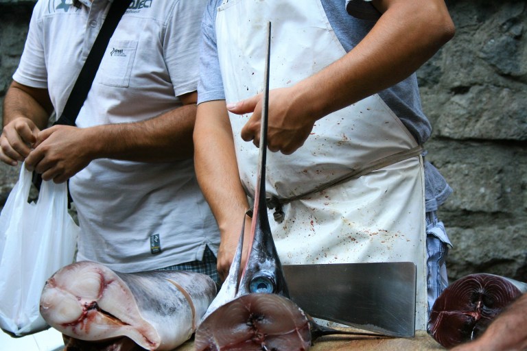 Pe lângă pești de tot felul, creveți, scoici și alte dihănii proaspăt pescuite, spectacolul adevărat îl fac vânzătorii. Jur că așteaptă să fii cu urechea cât mai pe direcție și eventual să te uiți pierdut în altă parte, ca să strige cu forță de tenor ce au proaspăt și apetisant în ofertă și să-ți bage sub nas o scoică de abia desfăcută cu cuțitul. Să-ți sară sufletul întâi de surpriză și apoi de râs că te-a luat o scoică pe nepregătite. Și între ei vorbesc, ca niște italieni sudici adevărați, în rafale puternice de strigăte și râsete, eventual sprijiniți lejer într-un satâr.