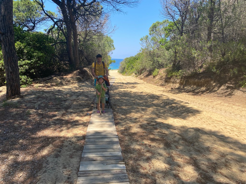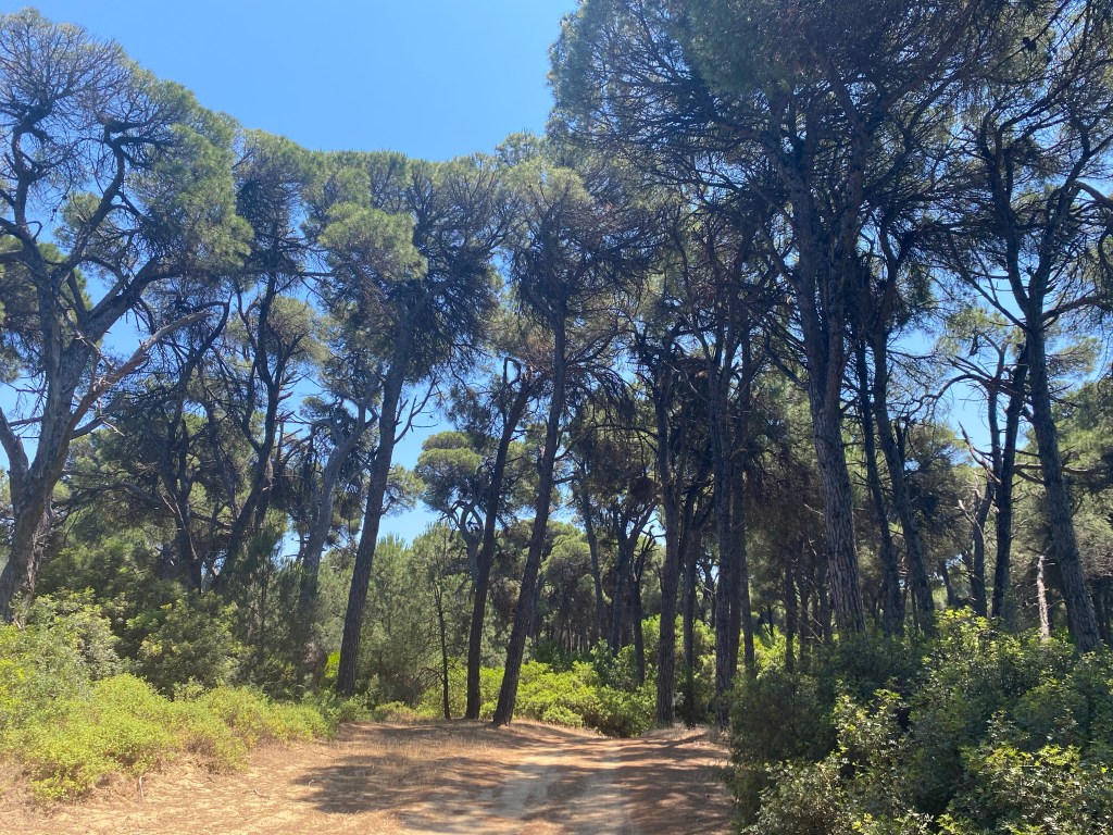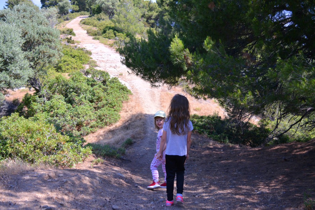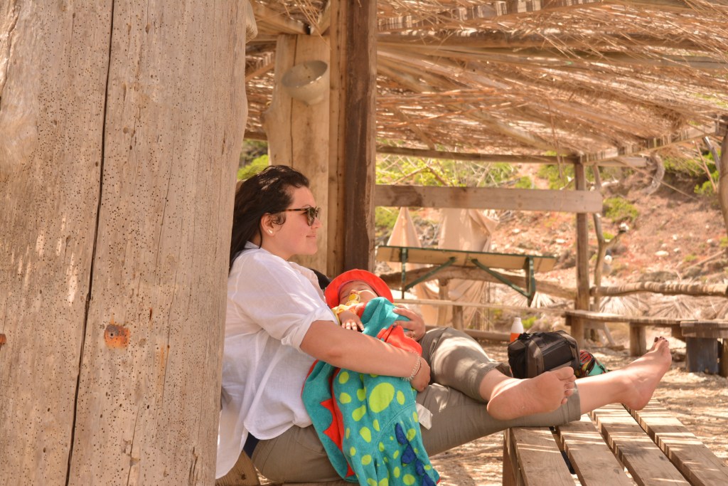 Ştiam de data trecută că plajele din nord sunt pe gustul nostru: mai sălbatice şi mai neşlefuite, plus că pentru a ajunge la ele mergi pe drumuri de pământ prin pădurea de pini rezervaţie naturală, un spectacol de copaci uriaşi, crescuţi pe nisip, păsărele, şopârlici şi raze de soare care sclipesc printre crengi. Data trecută ne-a plăcut mult Mandraki, acum mergem la Elia, care nu ne dezamăgeşte. Cum Radu nu ratează ocazia de a adormi pe mine în sistemul de purtare cât ne întoarcem la maşină, decid să nu îl trezesc şi să fac o plimbare pe jos prin rezervaţie, traversând insula de la nord la sud. Sună a bravură, dar e un punct îngust al unei insule oricum mici, 25 de minute de peisaj superb şi de linişte. Şi cărat 10 kilograme de copil adormit, dar nu le poţi avea pe toate.