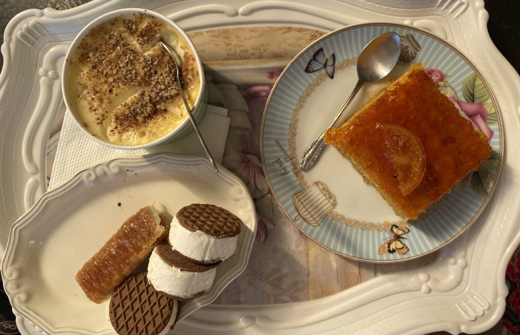 Dafni’s Sweets, tot în oraş. După un somn de prânz al copiilor în maşină, ajungem în oraş să mâncăm ceva dulce şi alegem cea mai recomandată cofetărie. Ne cam îndopăm cu prăjituri şi îngheţată, deci da, sunt chiar bune. Au şi o mică terasă, dar se cam încinge.