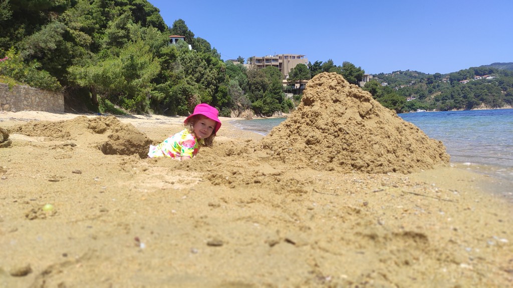 Noi avem cazare în zona Koukounaries, aşa că e prima plajă la care ajungem, pe seară în prima zi, măcar să salutăm marea, după ce ne bălăcim pe după-amiază la piscină. Nu poţi avea piscină la cazare şi să îi spui copilului din prima „mai târziu”. Koukounaries e una dintre cele mai mari, populare şi aglomerate plaje de pe insulă şi, ca urmare, nu îmi era chiar aşa simpatică, în ciuda alăturării cu o rezervaţie naturală, a umbrii minunate de pin şi a întrării line în apă. Acum e, însă, aproape goală, turismul deschizându-se doar de câteva zile în Skiathos. Aşa că mai revenim de câteva ori la ea şi ne bălăcim cu peştişorii de la mal, iar Vera se joacă cu Antonia, prietena pe care şi-o face în această vacanţă. Ore în şir de joacă la malul mării, o bucurie să îţi vezi copilul atât de entuziasmat. Bebe Radu, pe de altă parte, pare amator de nisip doar cât îl lăsăm să îl mănânce. Nici apa mării nu îl satisface momentan, aşa că din partea lui avem parte mai mult de mârâieli sau de cocoşat unul dintre părinţi cu somn în sistemul de purtare. Nu-i nimic, Răducule, creşti tu, reevaluezi situaţia şi parcă văd că nu te mai scot nici pe tine din apă, ca pe Vera.