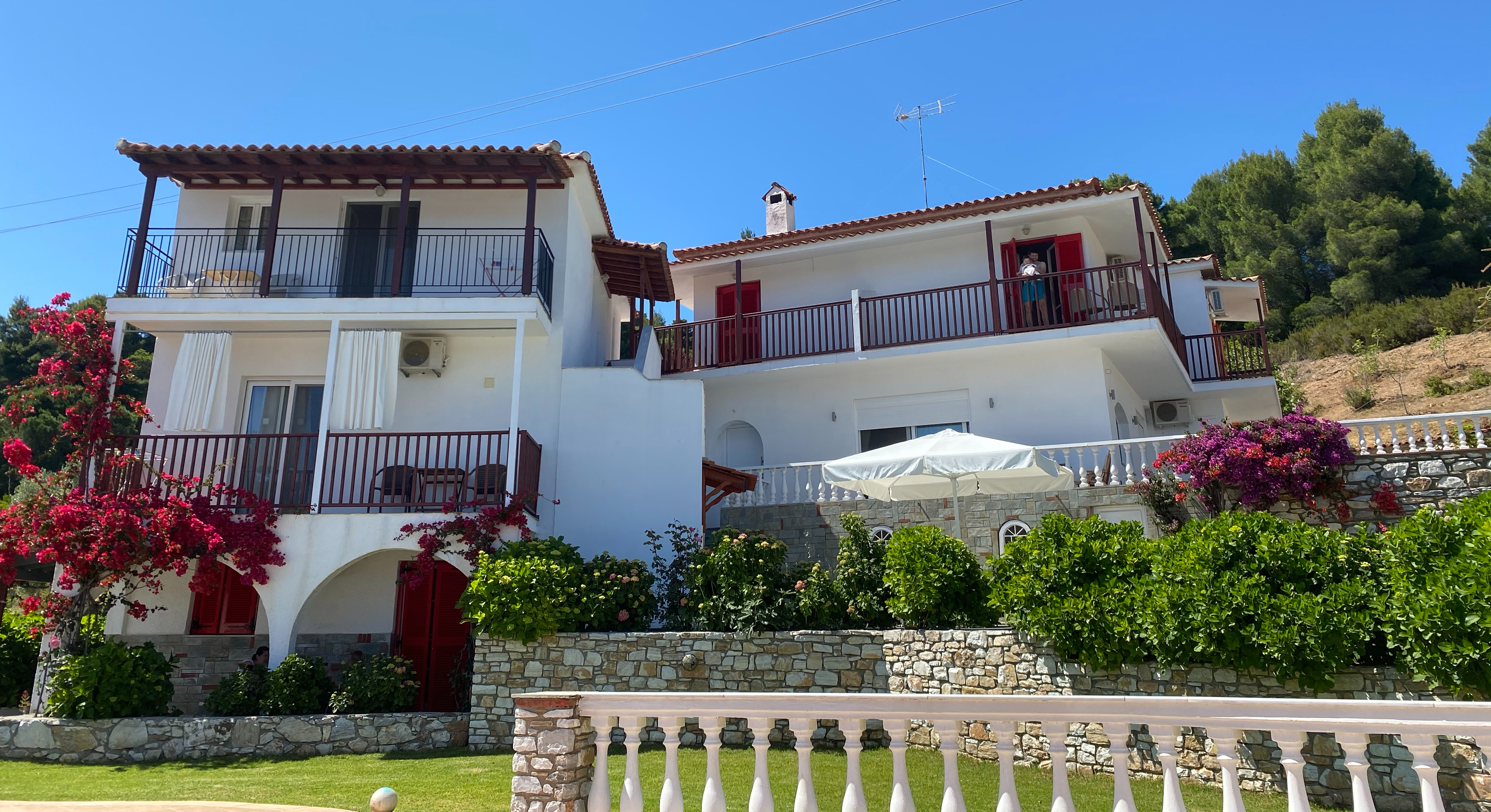 Cazarea. Am stat la Vila Alissia, în zona Koukounaries, că aşa a fost pachetul de la licitaţie, doar că am optat pentru apartament cu chicinetă, ca să satisfacem nevoile de somn şi foame ale familiei. Vila asta e ca zicala cu leopardul: afară gradină superbă, pădure în spate, piscină la dispoziţie, însă înăuntru mititel şi înghesuit, iar mobila şi tâmplăria sunt vechi şi foaaarte foarte zgomotoase. Plus pereţii subţiri, să auzi şi scârţâielile vecinilor (foarte liniştiţi, de altfel), deci „vis” pentru somn de bebe. Vis şi pentru vecini, care îl salutau pe Radu cu „azi parcă te-ai trezit mai târziu”. N-a fost, deci, chiar ce îmi doream de la cazarea de concediu, dar îmi asum în totalitate că n-am căscat cum trebuie ochii să văd că are două stele, că mă uitam sigur să mai achit o diferenţă pentru un upgrade la alt hotel (opțiuni sunt multe pe site). În concluzie, dacă sunteţi fără copii sau cu copii mai mari sau nesensibili la zgomot, Vila Alissia e o opţiune budget friendly foarte ok, mai ales că se face curăţenie temeinică în fiecare zi lucrătoare. Dacă vrei linişte şi ceva mai mult spaţiu, sunt sigur opţiuni mai bune.