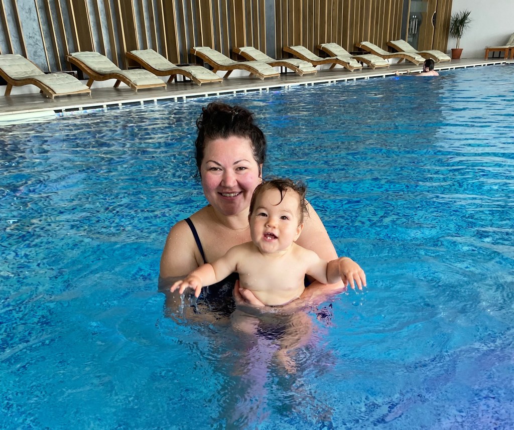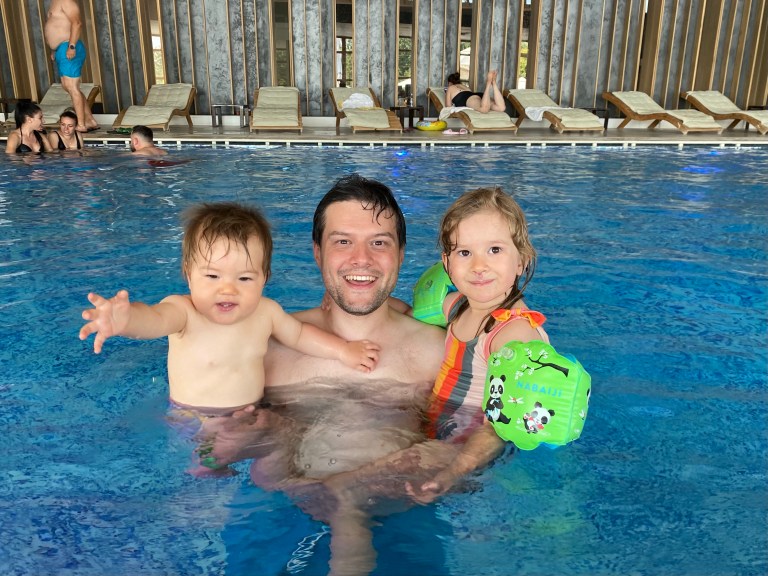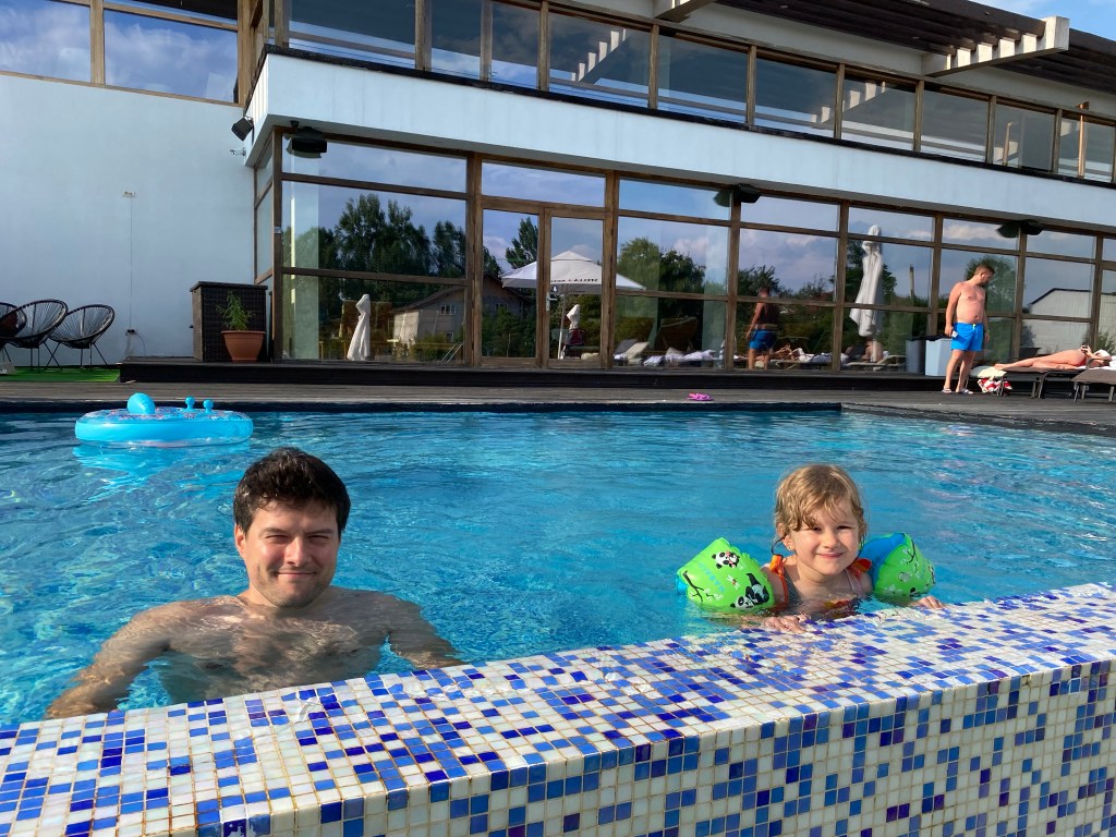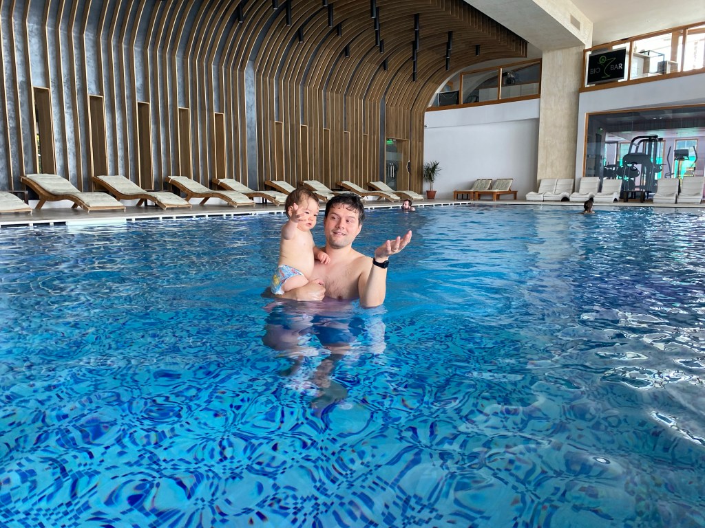 Piscinaaaaaa! Cea interioară cel mai mult. Ne-am îmbăiat literalmente de toți banii. Ne-au ținut copiii la bălăcit și pleoscăit cu orele în fiecare zi, până ni s-a încrețit pielea și ni s-au murat gândurile. Piscina interioară e mare, curată, cu temperatură optimă atât în apă cât și în aer (ceea ce e mare lucru: nu se face atmosferă din aia greu respirabilă tip saună), vestiare și toalete foarte ok. Piscina exterioară e mai micuță, încălzită și ea, dar nu prea există umbră, iar soarele era prea puternic să zăbovim cu picii pe acolo. Nu a fost nici prea aglomerat, deși se poate veni și fără să ai cazare acolo. Înțeleg din ce mi-au povestit alții că și saunele și masajul sunt foarte ok, dar n-am avut condițiile familiale pentru așa ceva. Spa-ul e în clădire separată de cazare și restaurant, deci cu doi copii mici n-ar fi fost chiar amuzant să facem schimbare la vestiar de câteva ori pe zi dacă veneam pe vreme rece.