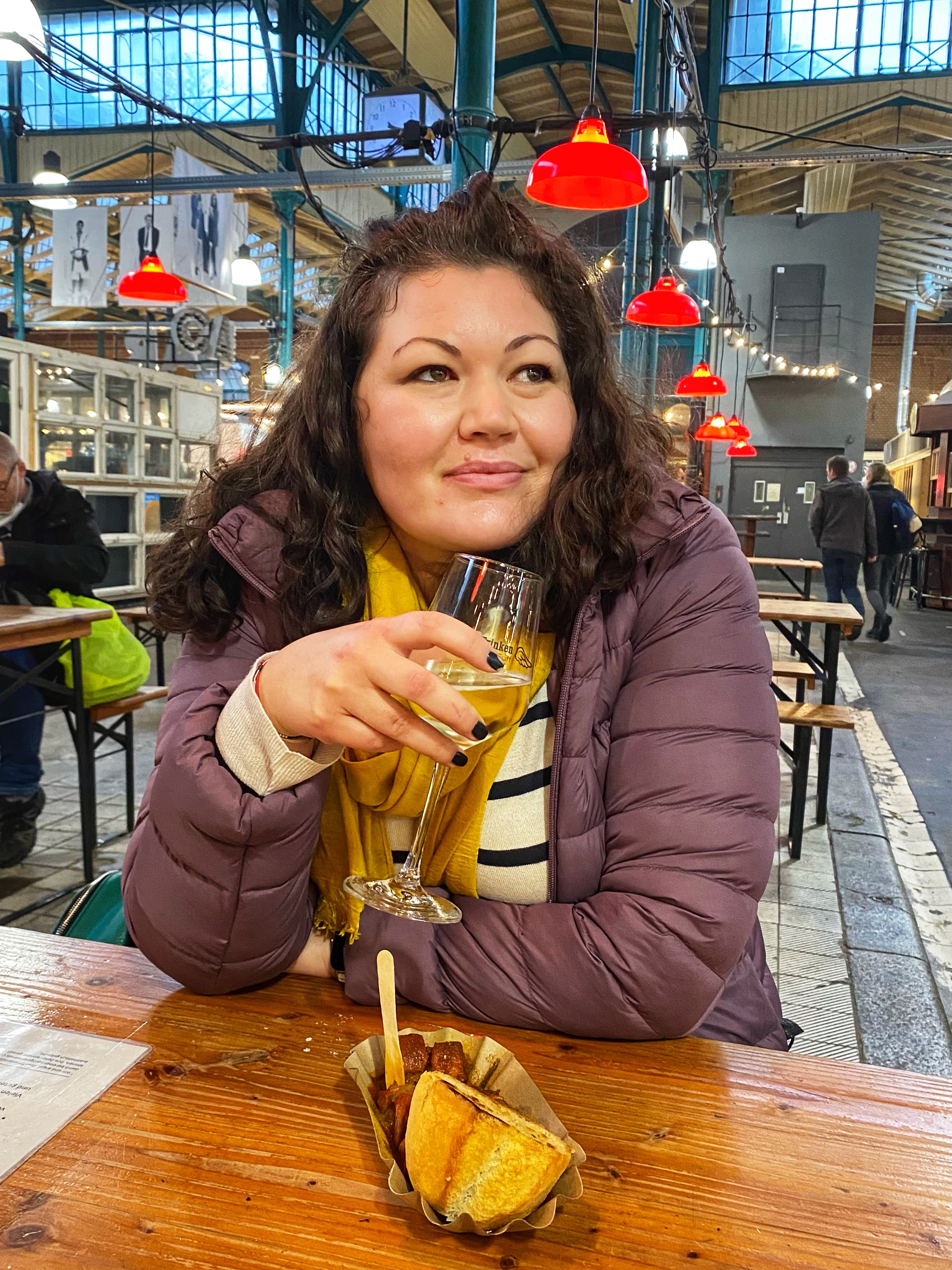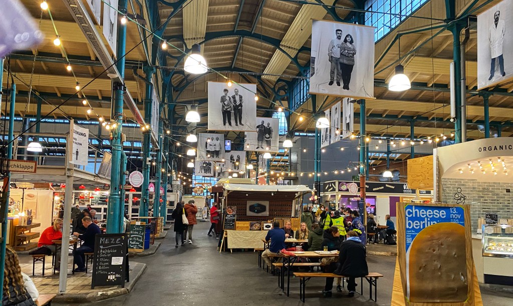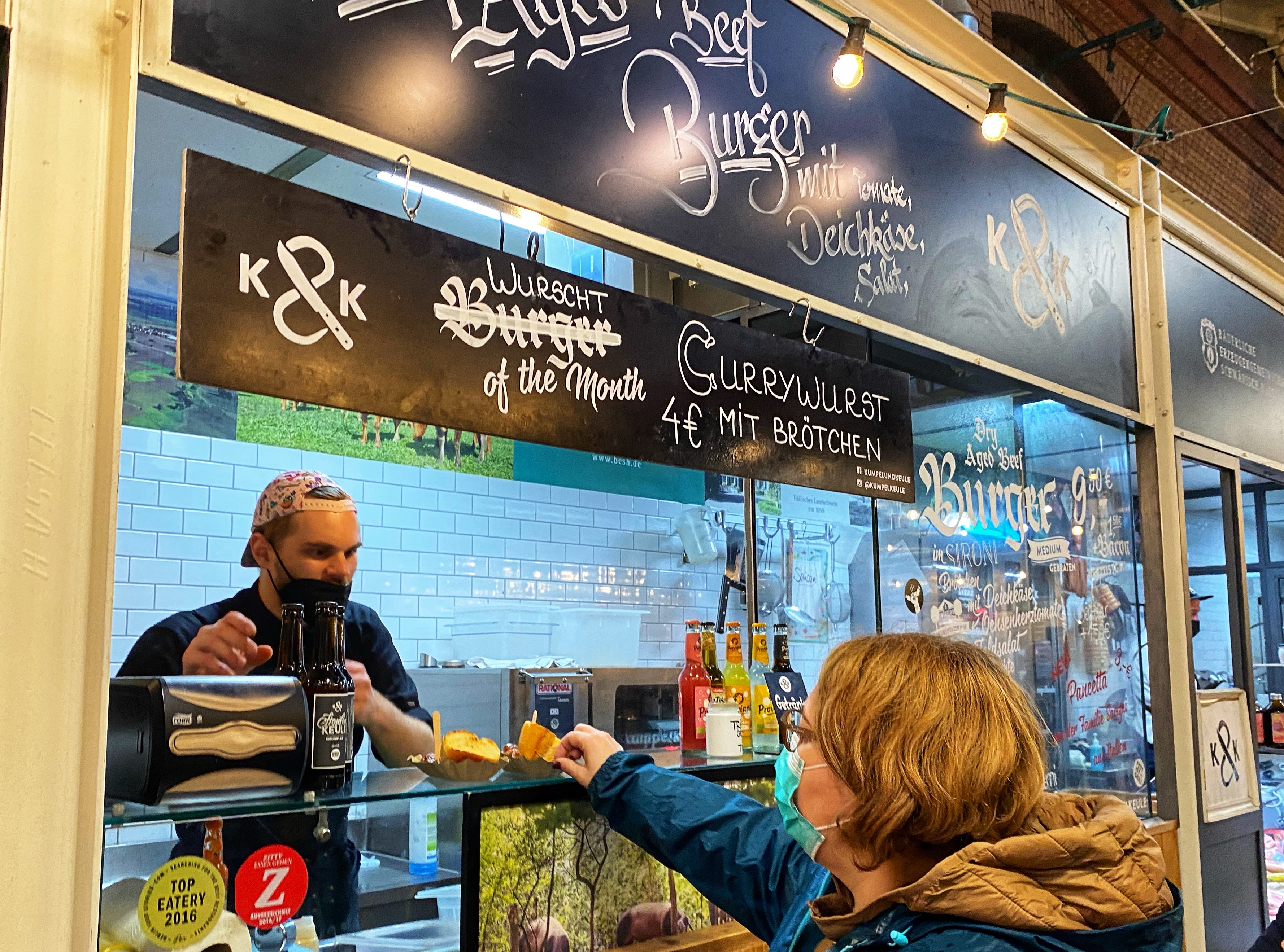 Joi plouă de dimineaţă până seara, aşa că alternăm statul în ploaie cu activităţi la interior. Cum ne e şi puţin foame pe după-amiză, dăm o fugă la Markthalle Neun. E în Kreuzberg, aproape de râu şi s-a dezvoltat destul de mult ca loc de ieşit la masă, dar încă are şi standuri cu produse, care să mai păstreze atmosfera de piaţă. Opțiunile sunt variate, de la asiatic, italian, turcesc până la curry wurst-ul local, pe care nu puteam să îl ratăm. Nu e vreo minune, dar intră decent cu un pahar de prosecco (da, da, pe ploaie şi frig refuz să beau bere) şi atmosfera relaxată. Are si loc de joacă, dacă veniţi cu piticii.