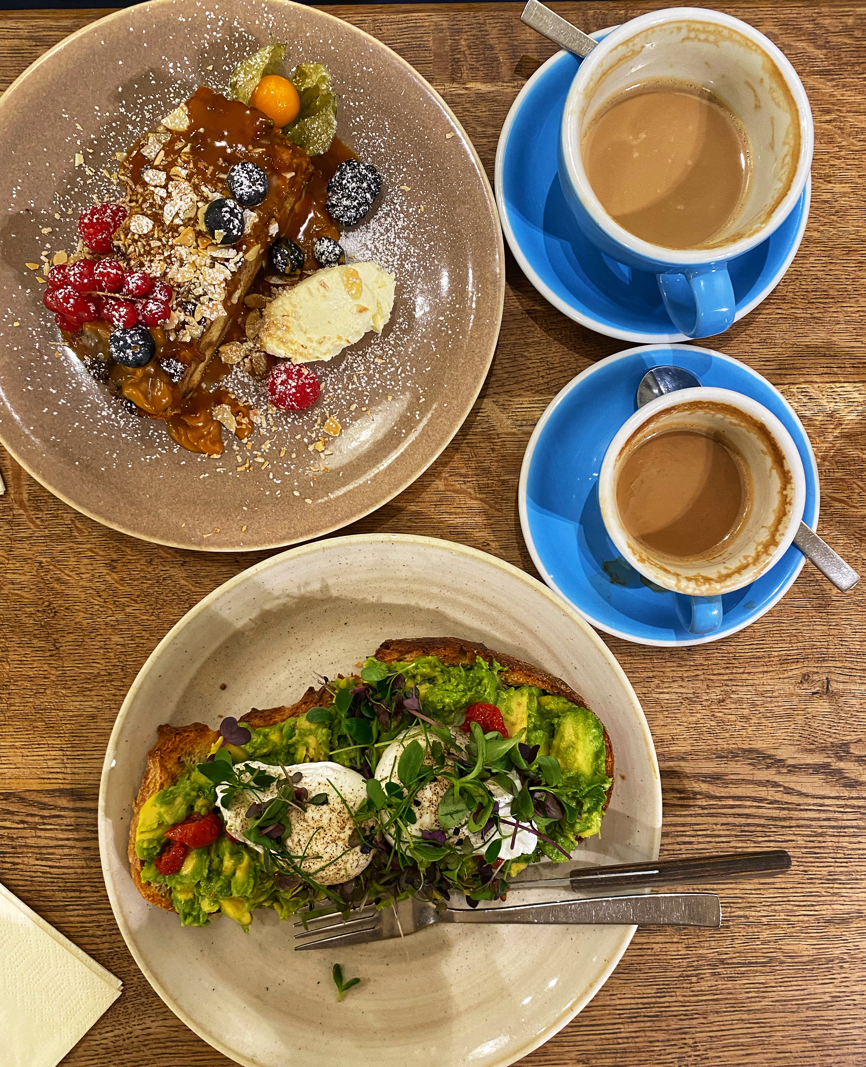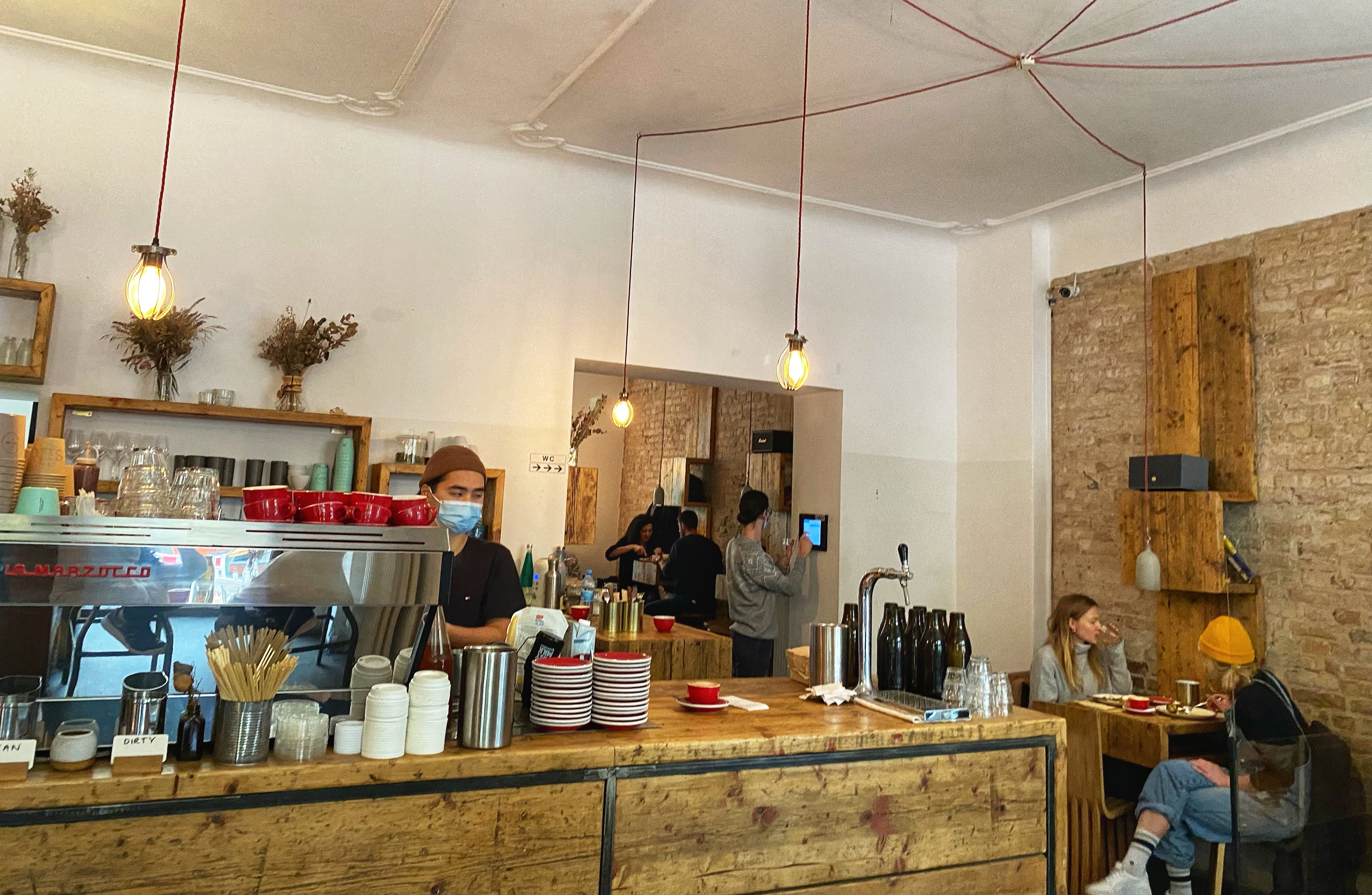 Fără să fiu cine ştie ce cunoscătoare, sunt mare fan cafea de specialitate. Iar micul dejun (sau brunch-ul, după caz) e de mulţi ani masa favorită a zilei. Astfel că pe unde merg în plimbări, fără copii, prefer să nu am mic dejun la cazare şi, în funcţie de zona pe care o explorăm ziua respectivă, să cercetez dinainte care sunt cele mai recomandate opţiuni de cafea de specialitate şi mâncare de dimineaţă pe acolo, ideal combinate. Sigur că asta rezultă de cele mai multe ori să ajung la cârciumile foarte populare la momentul respectiv şi chiar la stat la coadă pentru loc, dar în general am concluzionat că nu sunt recomandate degeaba. La fel şi la Berlin.