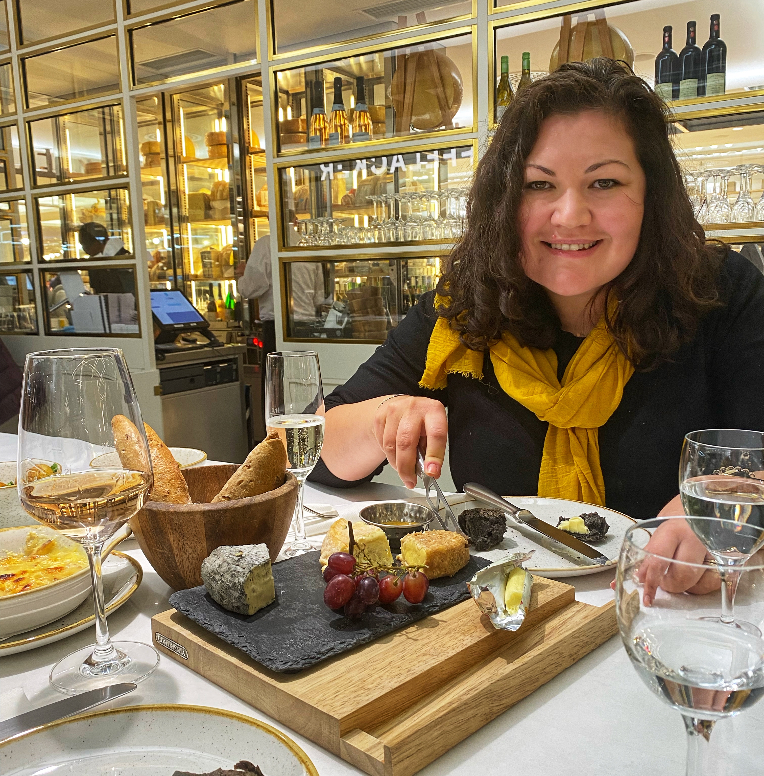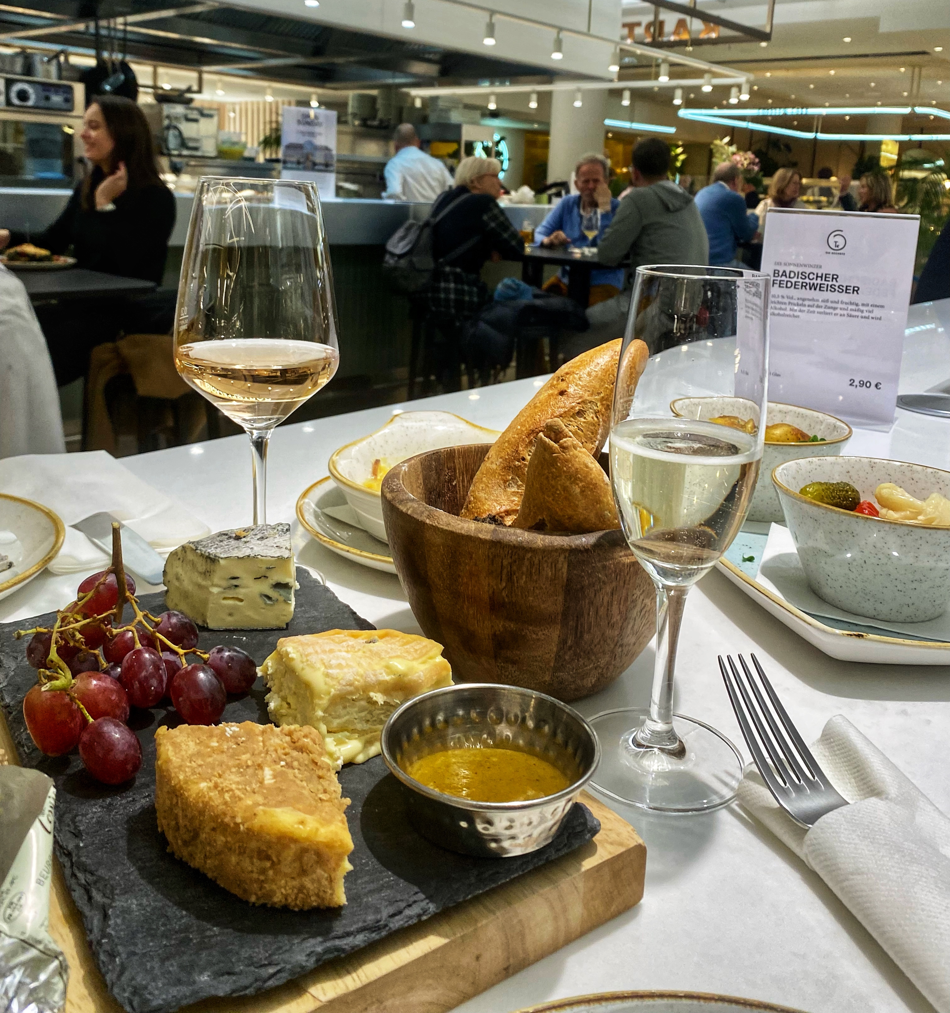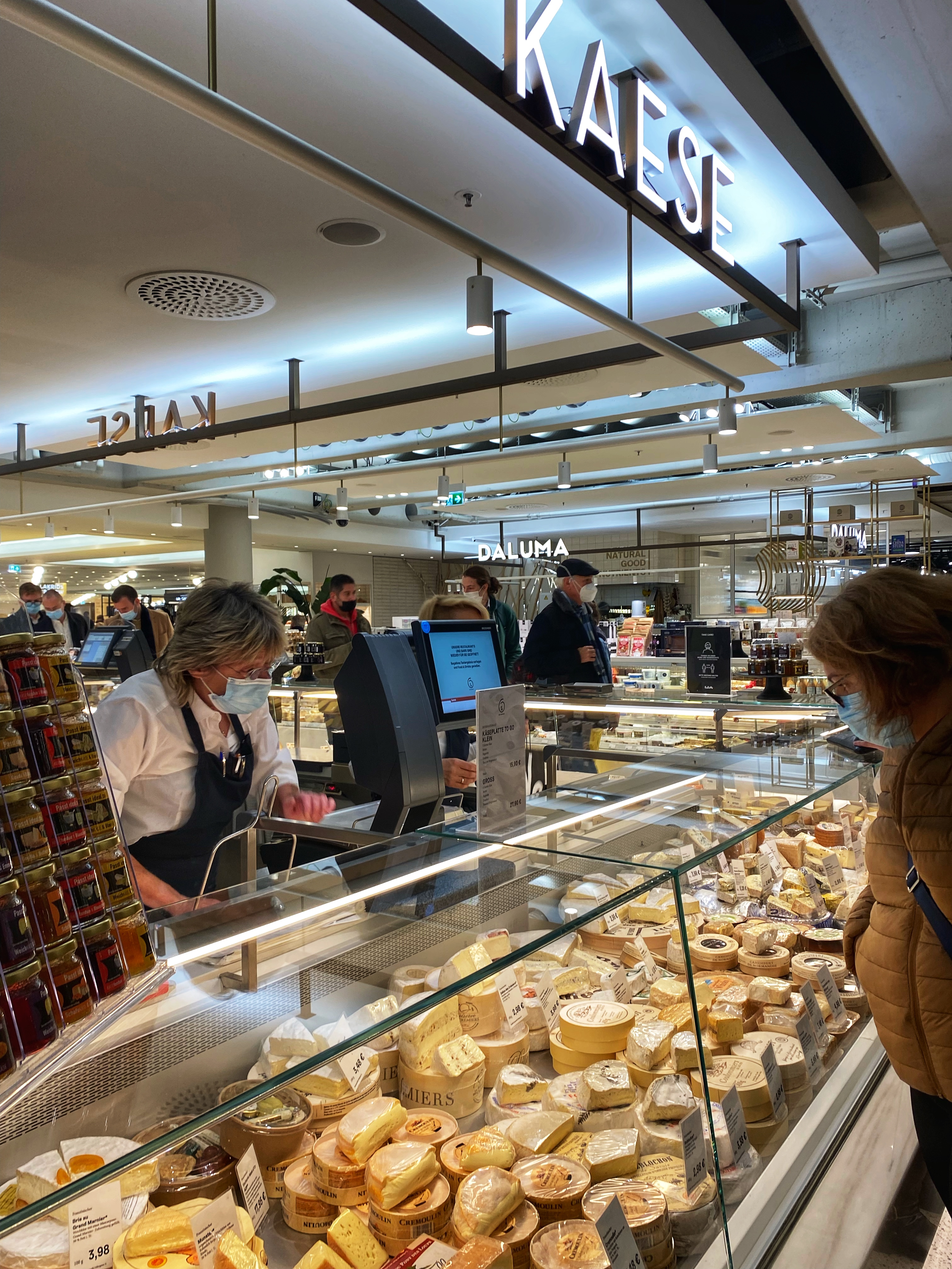 Nu e nici restaurant, nici piaţă, ci cel mai cunoscut magazin universal din oraș, un fel de Harrods al Berlinului, unde găseşti de la Louis Vuitton şi Dior (se aştepta la coadă, apropos) la un etaj întreg de decoraţiuni pentru Crăciun. Dar nu pentru ele ajungem, ci pentru etajul de mâncare. Cum Mădălina e lăptăreasă şefă (sic!) la Lăptăria cu Caimac, nu putem rata raioanele de produse lactate şi o cină timpurie cu selecţie de brânzeturi, raclette şi vin. Sunt şi alte resturante pe etaj, wine bar, prosecco bar şi cafenea, plus praline şi ciocolată, vinuri şi alte bunătăţi; răbdare şi buget să ai.