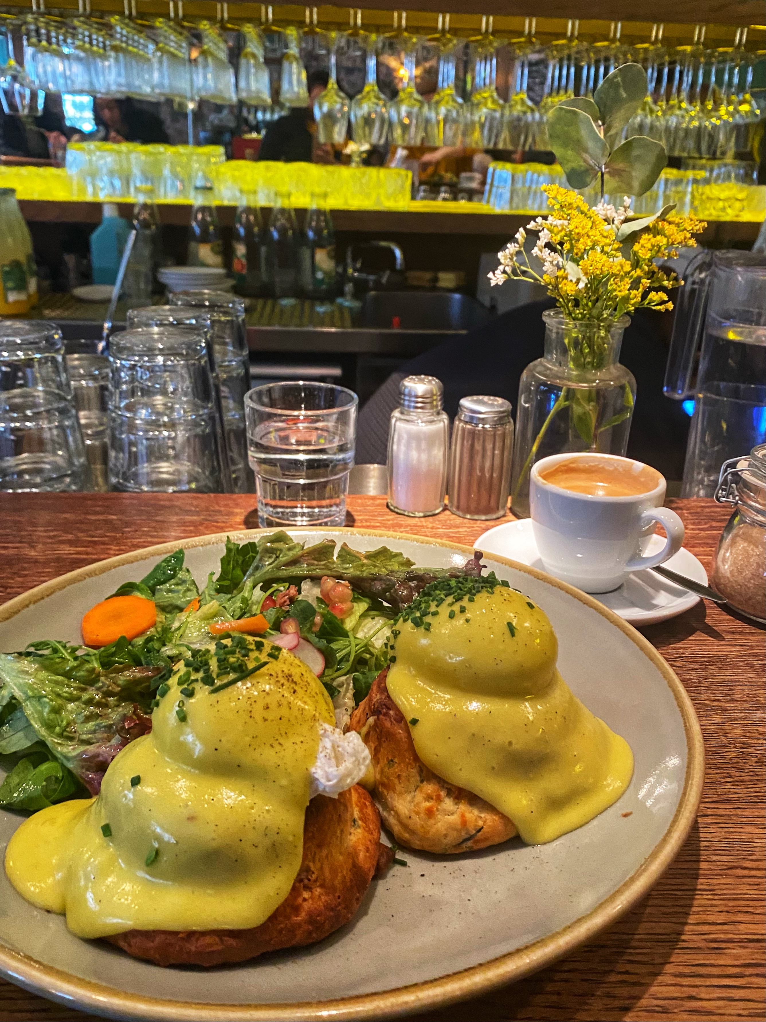 Miercuri dimineaţă deja plouă mărunţel şi hotărât, aşa că luăm metroul două staţii să ne lase în zonă: tot în centru, dar nah, e mare Berlinul. Depistăm curtea interioară cochetă în care se află localul şi aşteptăm vreo 10 minute pentru o masă. E aglomerat, dar se mişcă rapid şi nu sunt probleme. Meniul e ce te aştepţi: avo-toast cu ouă poşate, croque-uri şi alte preparate cu ouă şi veggies în feluri variate, plus dulcegării. Foarte gustos ce comandăm, foarte drăguţă atmosfera, excelentă şi cafeaua; pot să recomand mai departe. Au şi prăjitorie, în cooperare cu Silo Coffee (vezi mai jos), deci se îngrijesc singuri de calitatea cafelei lor. Când e frumos afară, se poate sta şi la terasă, deci se multiplică locurile disponibile. În plus, am văzut că acceptă rezervări.