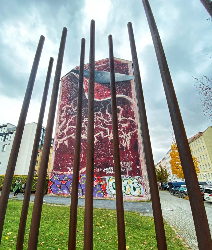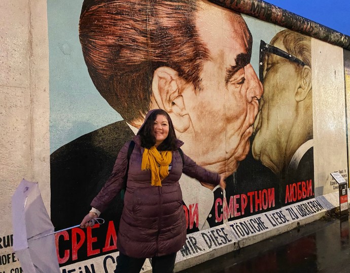 Nu că vizităm cluburi, dar ajungem prin acest cartier parte din fostul Berlin de Est în două rânduri. Întâi aproape pe întuneric şi ploaie torenţială să vedem East Side Galery, o galerie în aer liber cu peste 100 de murale pictate pe o parte conservată din zid. Probabil cel mai cunoscut este Sărutul, ce îi înfăţişeză pe liderul sovietic Leonid Brezneh şi preşedintele Germaniei de Est, Erich Honecker, într-un sărut „frăţesc”. Şi să-şi cumpere Mădă încălţări, că, nah, prea multă apă. Şi nu se cade să stai cu picioarele fleaşcă la cină.
