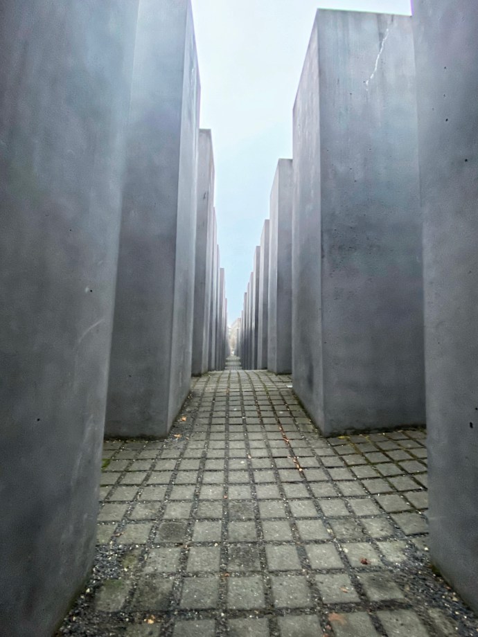 Aproape de poartă traversăm Memorialul Holocaustului (care mai exact e „Memorial to the Murdered Jews of Europe”), un spaţiu de 19.000 de metri pătraţi cu lespezi verticale printre care poţi trece. Terenul e vălurit şi la un moment dat eşti înghiţit cu totul, fără legătură cu exteriorul, iar sentimentul e destul de apăsător, ceea ce bănuiesc că a fost şi intenţia. A reuşit.