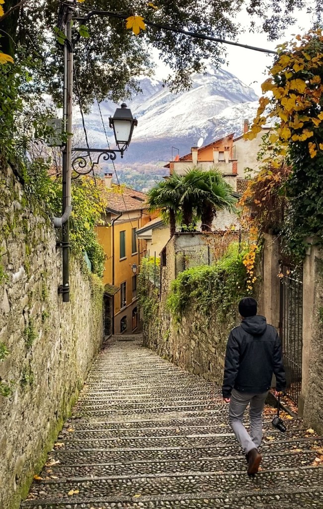Bellaggio e ceva mai mare şi mai bogat decât Varenna, cu domenii luxoase sus pe deal, promenadă elegantă şi resturante mai fiţoase, nu toate deschise acum. Ne plimbăm până în vârful peninsulei, la Punta Spartivento, apoi o luăm pe străduţe în interior, în urcuş uşor. Vedem la un moment dat nişte scări şi un indicator către Pescallo, un sătuc lipit de Bellaggio, pe partea cealaltă a peninsulei. Decidem să cercetăm şi, după ce mai urcăm un pic, coborâm de tot pe partea cealaltă. Pitoresc şi cu un vibe foarte autentic, nu-i vorbă, dar cine coboară, trebuie să şi urce înapoi. Pe piatră cubică, printre ziduri cu mult muşchi. Prilej să îmi amintească gâfâitul că ar trebui să mai fac şi eu sport. Pe Google Maps găsiţi traseul acesta ca Salita Cappuccini; merită plimbarea, chiar dacă mai scoţi limba la un moment dat.