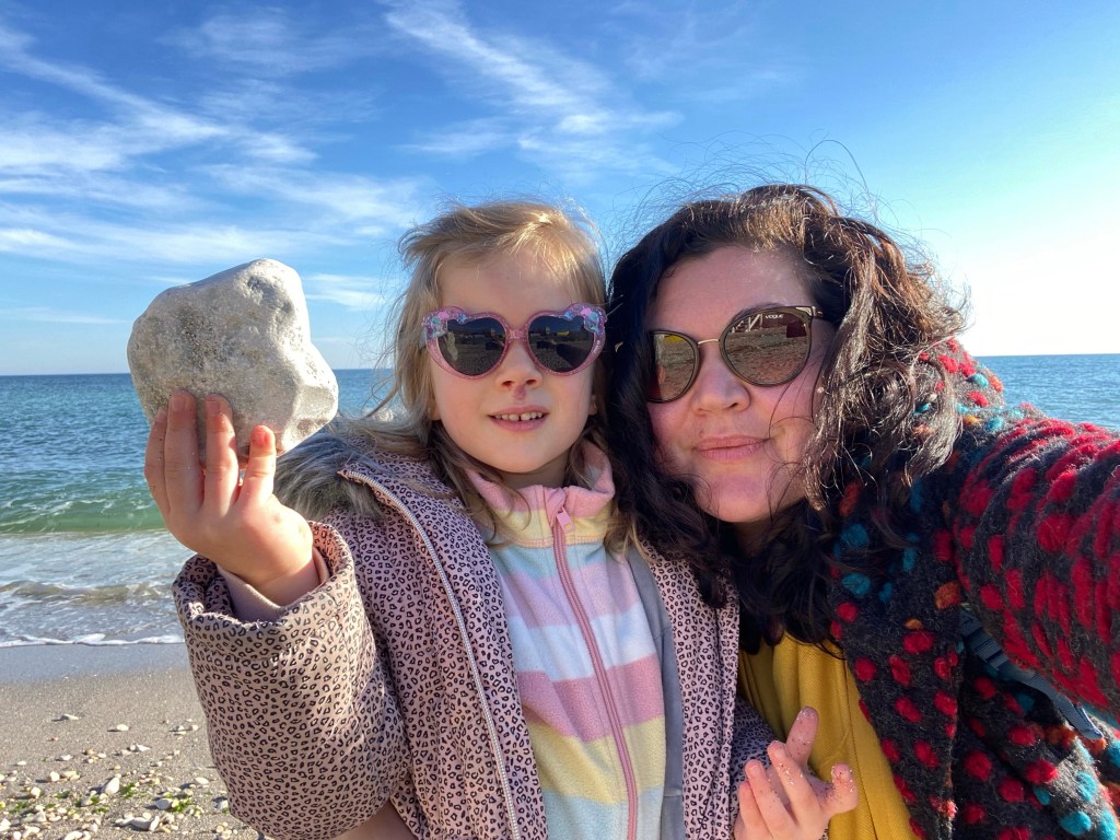 Vrem să ajungem şi pe plajă, dar să şi mâncăm de prânz, aşa că mergem la Pescăria lui Matei. Sunt ceva ani de când n-am mai fost şi a crescut ca Făt Frumos şi e pliiiin, deşi e miercuri la prânz. Lucrurile se mişcă operativ şi toată lumea mănâncă, inclusiv Vera-nu-mi-place-peştele (cine mai mănâncă piept de pui la pescărie?!?!). Bravo, Matei, super treabă ai făcut. Petrecem şi destul de mult timp pe plaja Agigea, chiar alături, unde alergăm pe nisip, ne căţărăm pe pietre, ne pozăm şi testăm apa. Vera „dă de mâncare” valurilor pietre şi alge şi cred că ar putea face treaba asta până seara dacă aş lăsa-o. Îmi creşte şi admiraţia pentru pantofii de la Decathlon pe care i-am luat ca rezistenţi la apă, dar nu mă aşteptam să dovedească şi valurile venite peste picioare, din prea mult entuziasm faţă de apă. Întâlnirea cu marea e grozavă de fiecare dată şi bucuria copilului (şi a mea, de ce să nu zic) e minunată.