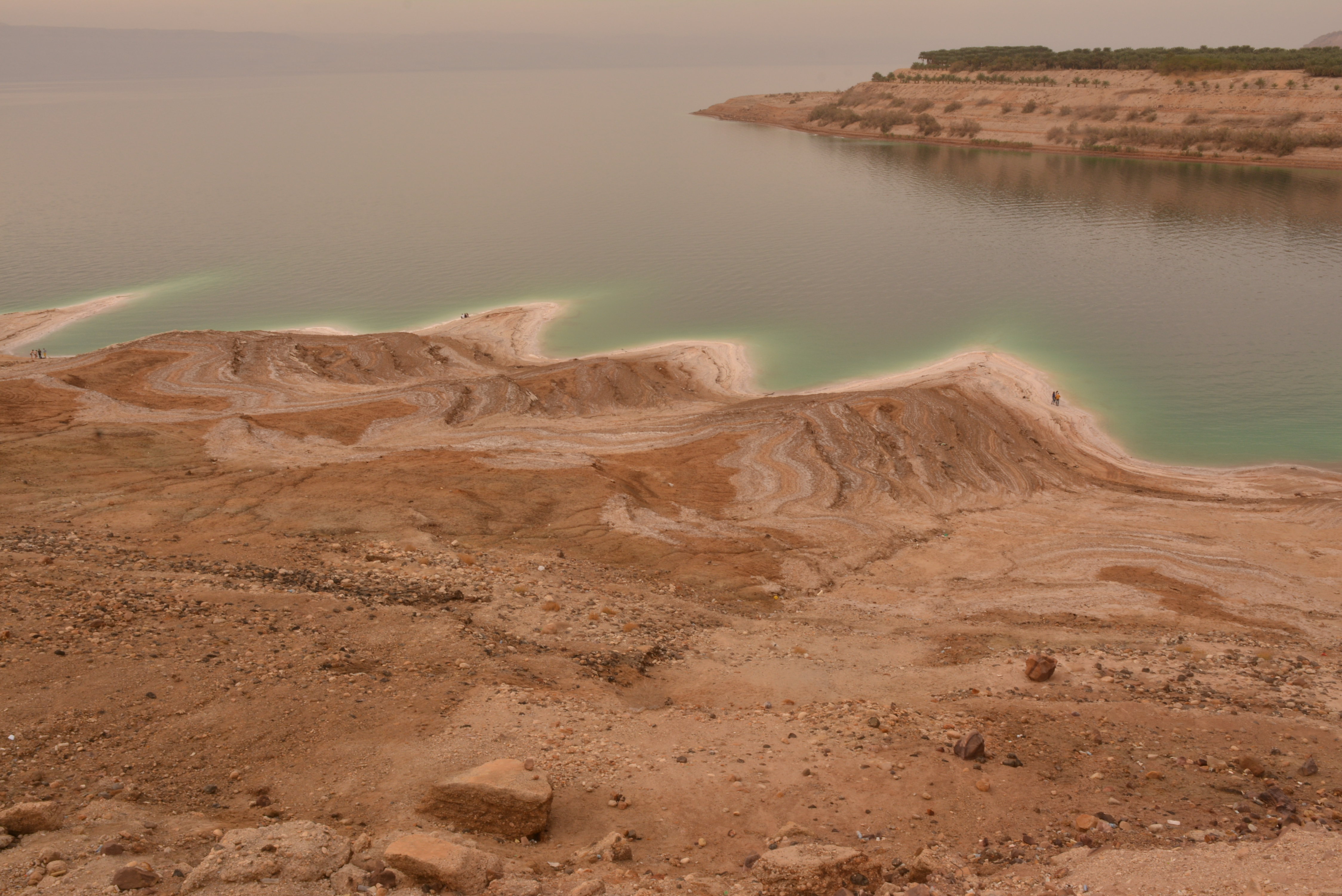 Cu cât de apropiem de Marea Moartă, apar în zonă şi petece de verde: agricultură bazată pe irigaţii susţinute; ceva legume şi palmieri, posibil curmali. Apar şi turme de capre şi multă sărăcie: case neterminate, copii în picioarele goale, corturile de locuit ale păstorilor, ce îmi amintesc de bordeie, multă mizerie. Apar şi parcelele de evaporare a apei pentru obţinerea sării, plus şantierele de procesare a ei. Nu e pitoresc şi bucolic, e o zonă care îţi arată dificultăţile vieţii în peisajul acesta arid.