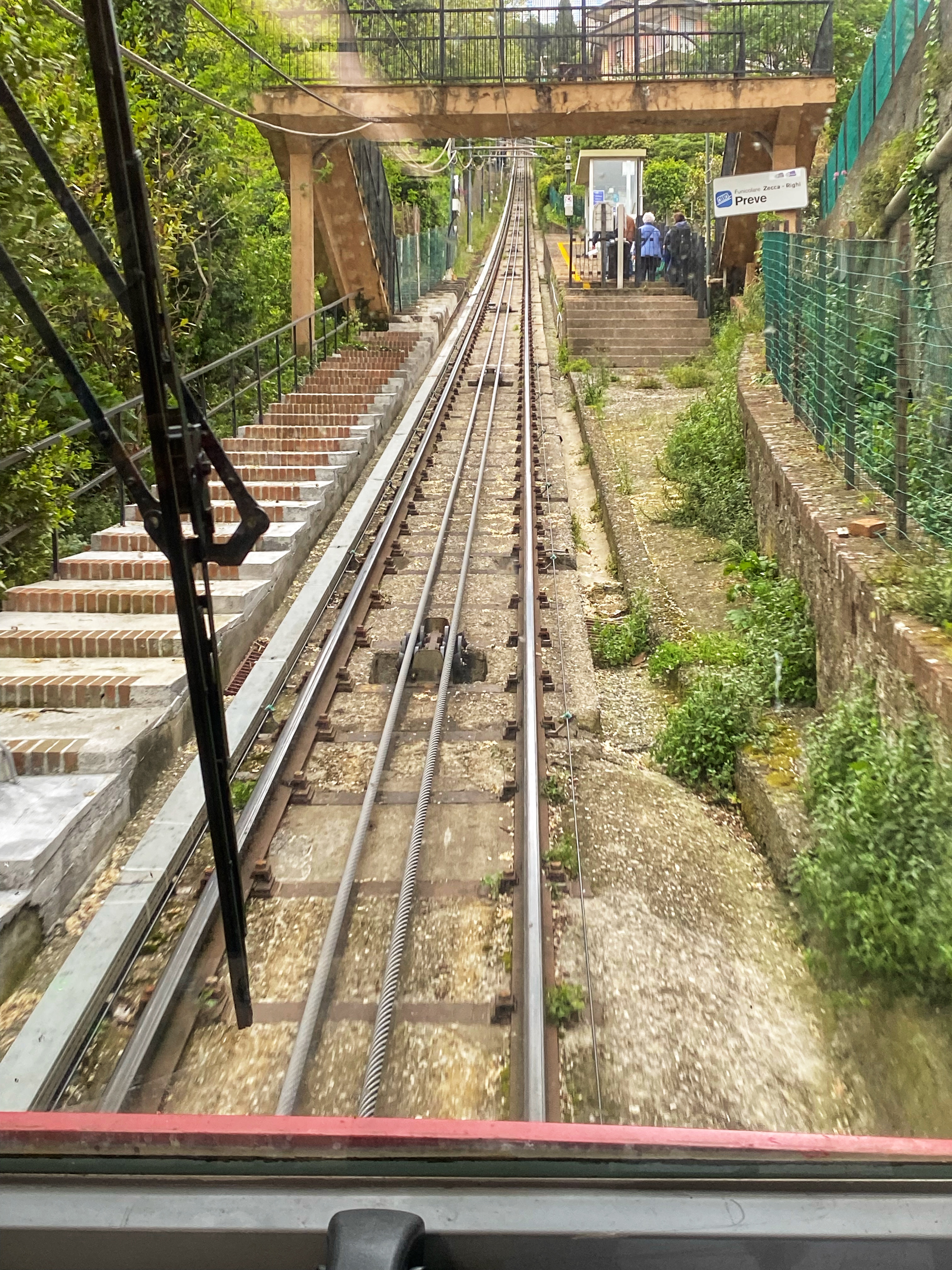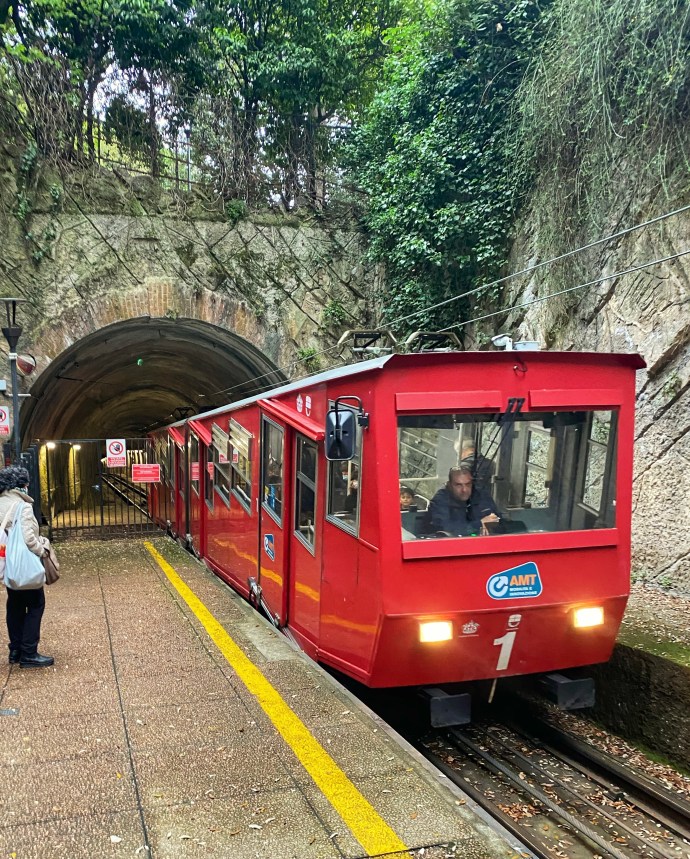 Funicularele sunt altă veselie. Cel mai lung traseu îl are funicularul Zecca-Righi, întâi prin tunel, apoi direct printre case, până într-o zonă foarte elevată şi foarte verde a oraşului, de unde se pot face multe plimbări şi trasee. Noi ajungem la o staţie pe parcursul său din întâmplare, bănănăind prin oraş, dar chiar nu se poate să îl ratăm odată ce îl descoperim şi clar nu ne pare rău. E ca un mic tramvai în trapte, tras de funia dintre şine, care se strecoară foarte aproape de case, dezvăluind astfel din viaţa de zi cu zi. De sus, panorama asupra oraşului şi a portului este spectaculoasă. Şi pizzeria fix de lângă staţia de sus merită o vizită.