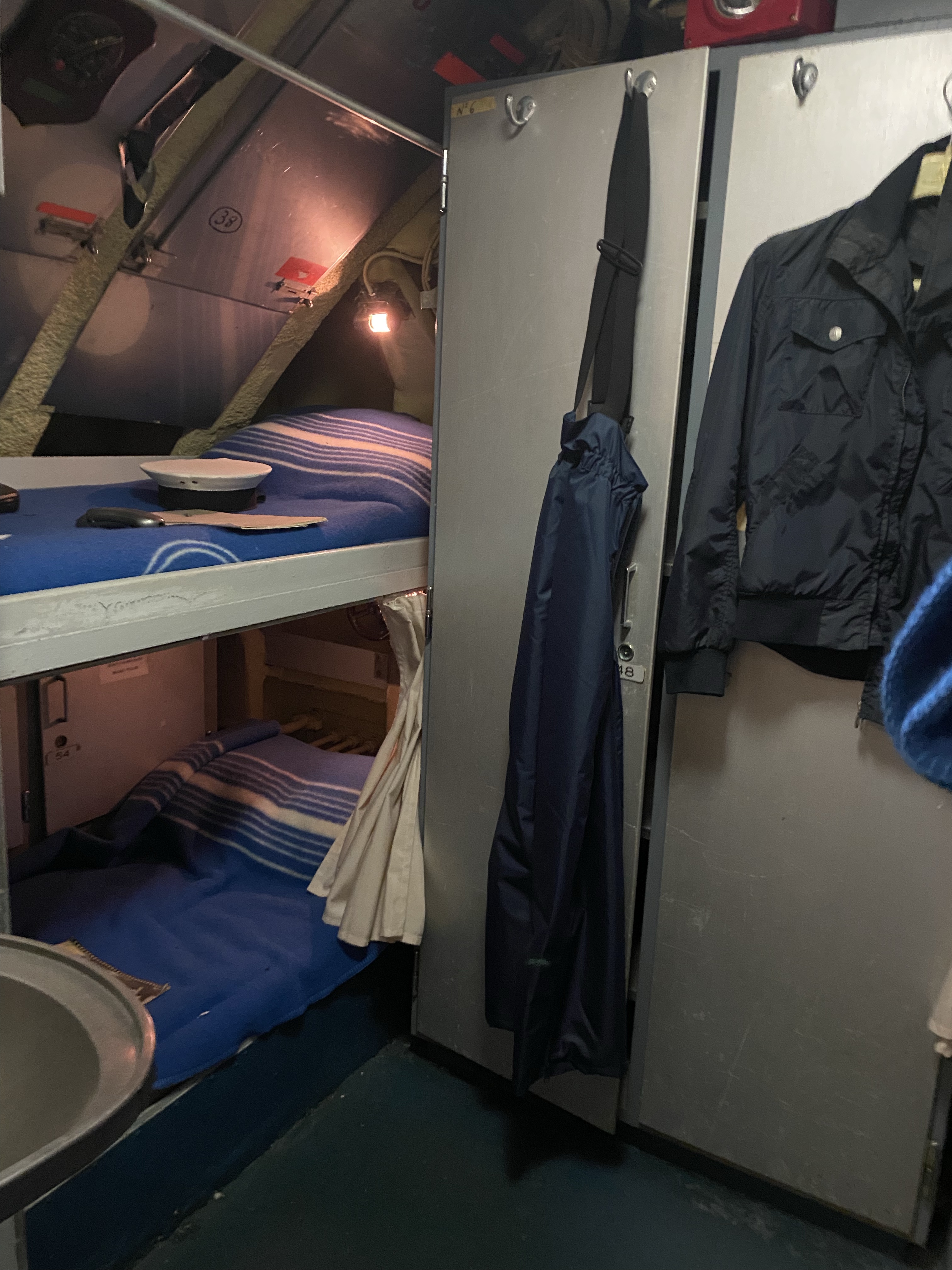Ne luăm căştile de protecţie – e atât de strâmt încât sigur dai cu capul de ceva – şi coborâm în lumea înghesuită, plină de butoane, cadrane şi comenzi a submarinului. Doamne, cât e de mic spaţiul! Pe lângă miile de instrumente şi reglaje, vedem şi spaţiile de dormit, mâncat şi socializat şi realizez că e ceva ce n-aş putea face niciodată. Nu sunt claustrofobă şi instruirea intensivă pe care o parcurg cei care lucrează pe submarine sigur dezvoltă nişte super abilităţi, dar să mă învârt în câţiva metri pătraţi împreună cu colegii, să nu văd lumina zilei şi să ştiu că deaupra mea apasă o lume acvatică întreagă e ceva pentru care eu sigur nu sunt construită. Vera e încântată dar şi un pic dezamăgită ca nu are geamuri prin care ai putea vedea peştii. Dacă nu îi vezi, care mai e rostul scufundării?