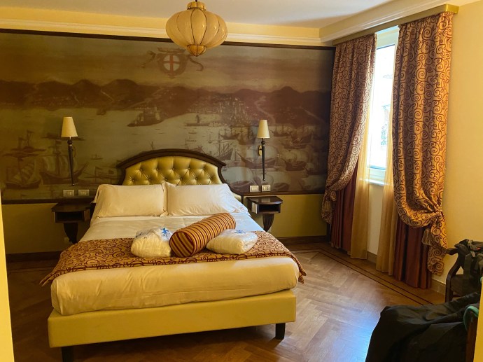 Cazarea. Am rezervat la hotelul Continental, lângă gară şi ne-au mutat (şi upgradat cu o stea) la frăţiorul Grand Hotel Savoya de alături, care deşi nu e nou şi e cam sobru, e foarte comod şi cu servicii pe măsura stelelor. Are şi un loc de joacă simpatic. A fost ok localizarea la gară: se ajunge imediat de la aeroport cu Volabus, repejor pe jos în Porto Antico, unde sunt multe atracţii şi facil în alte zone cu mijloace de transport în comun. Să fi stat mai multe zile, luam trenul spre Cinque Terre, nu e departe.