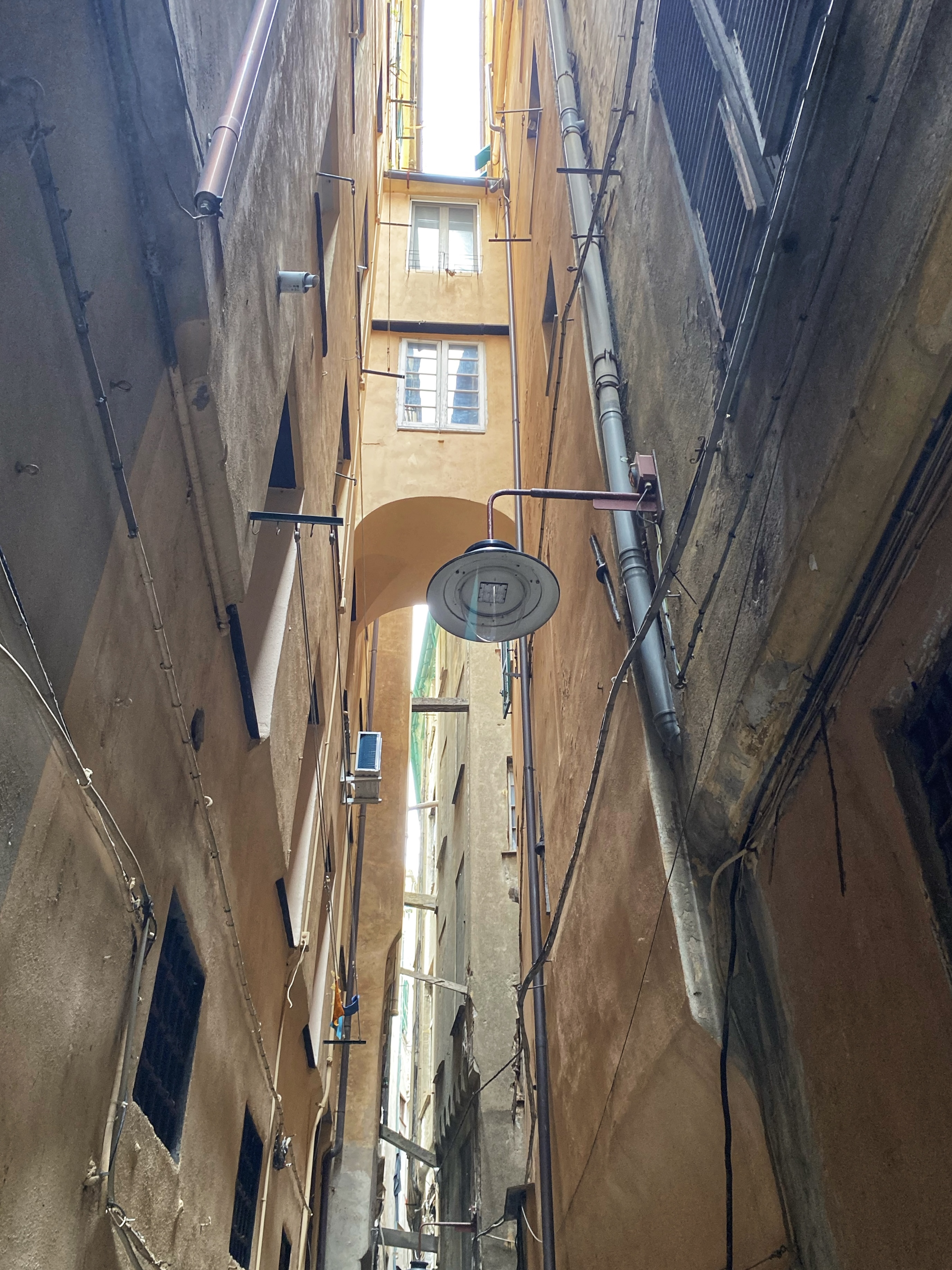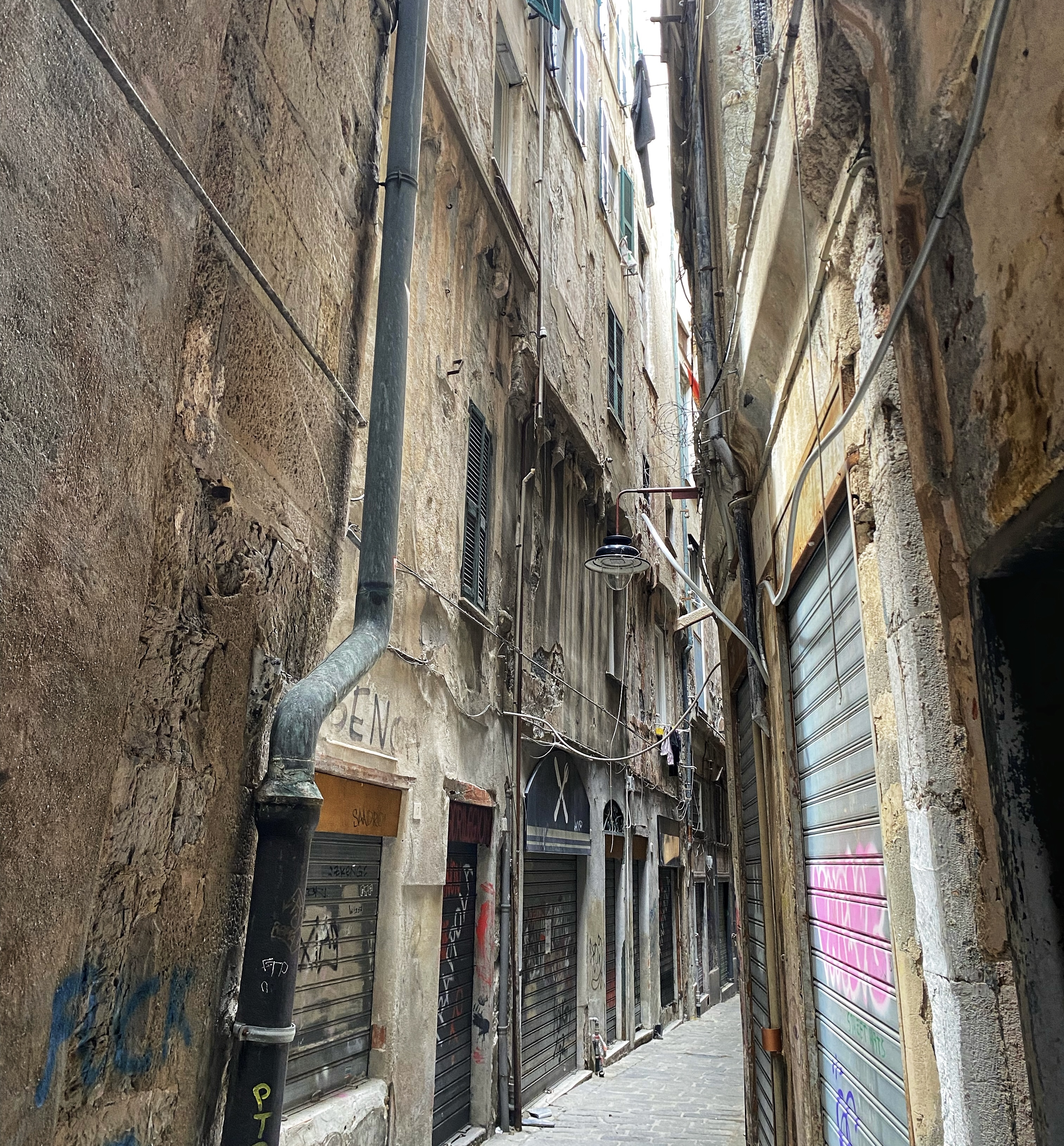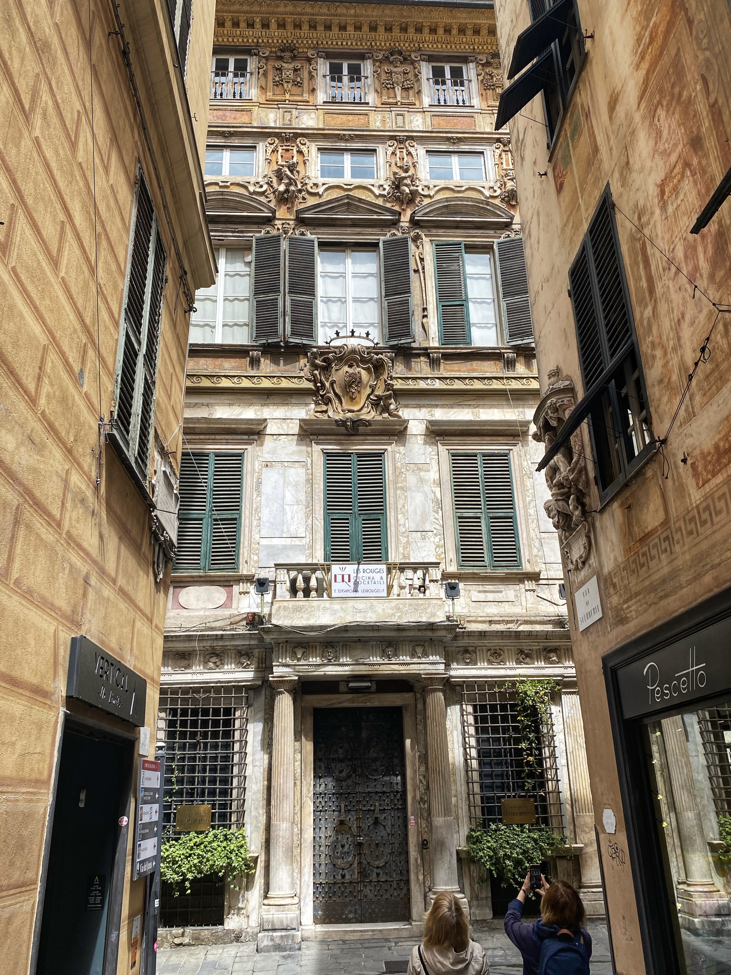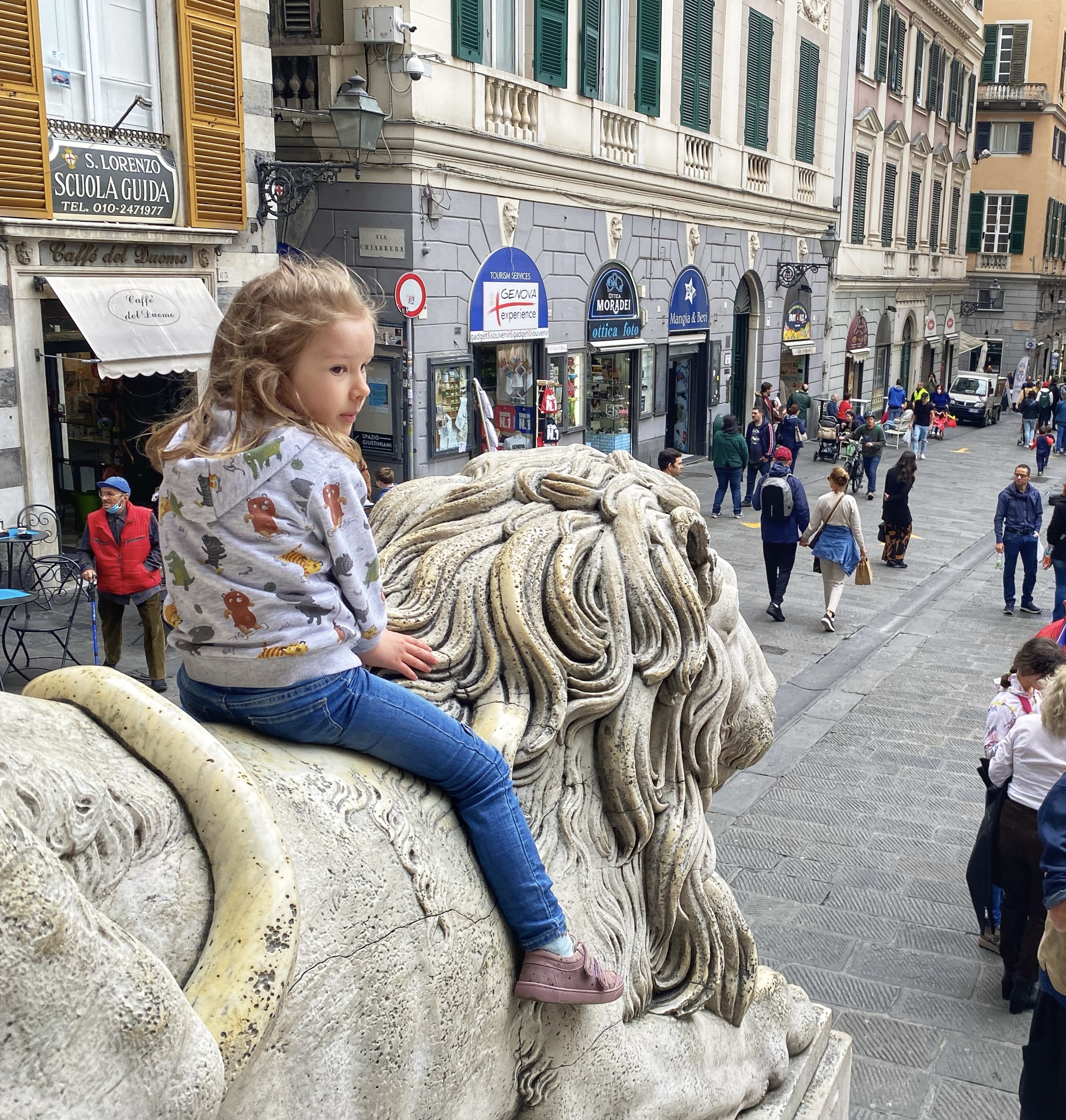 Străduţele înguste prin centrul vechi sunt de aşteptat în orice orăşel italian cu vechime, dar cum în perioada medievală Genova a fost o puternică republică marină, aici trebuiau să încapă mai mulţi oameni – deci s-au dus destul de mult şi pe înălţime – şi oraşul trebia să fie uşor de apărat. Au construit, astfel, un labirint de străduţe înguste (caruggi, în Liguria) sau foarte înguste printre clădiri destul de înalte, alei care să poată fi blocate la nevoie sau să îngreuneze mult accesul. Cred că lumina naturală la interior era un lux rezervat celor cu posibilităţi superioare: unele străduţe nu par să vadă niciodată soarele, altele sunt însă mângâiate constant de raze. Acum crează o oportunitate pitorească de plimbare şi explorare a centrului vechi: unele straduţe sunt cochete şi vibrante, cu magazine şi localuri, pe altele găseşti detalii arhitecturale interesante, iar altele sunt de-a dreptul împuţite. Cu Vera coborâm de la Piazza del Portello către port, luând-o pe unde ne vine fie în plimbare, fie în fugă, mâncând îngheţată, pierzându-i geaca şi făcând ceva shopping în consecinţă, oprindu-ne pentru o cafea, o porţie de paste sau o poză pe statuia-leu de la catedrală, lucioasă de la câţi copii au călărit-o. Poţi să faci drumul invers cu ceva trenuleţ turistic din port, dar mi se pare mult mai amuzant la picior şi inspiraţie de moment la fiecare cotitură.