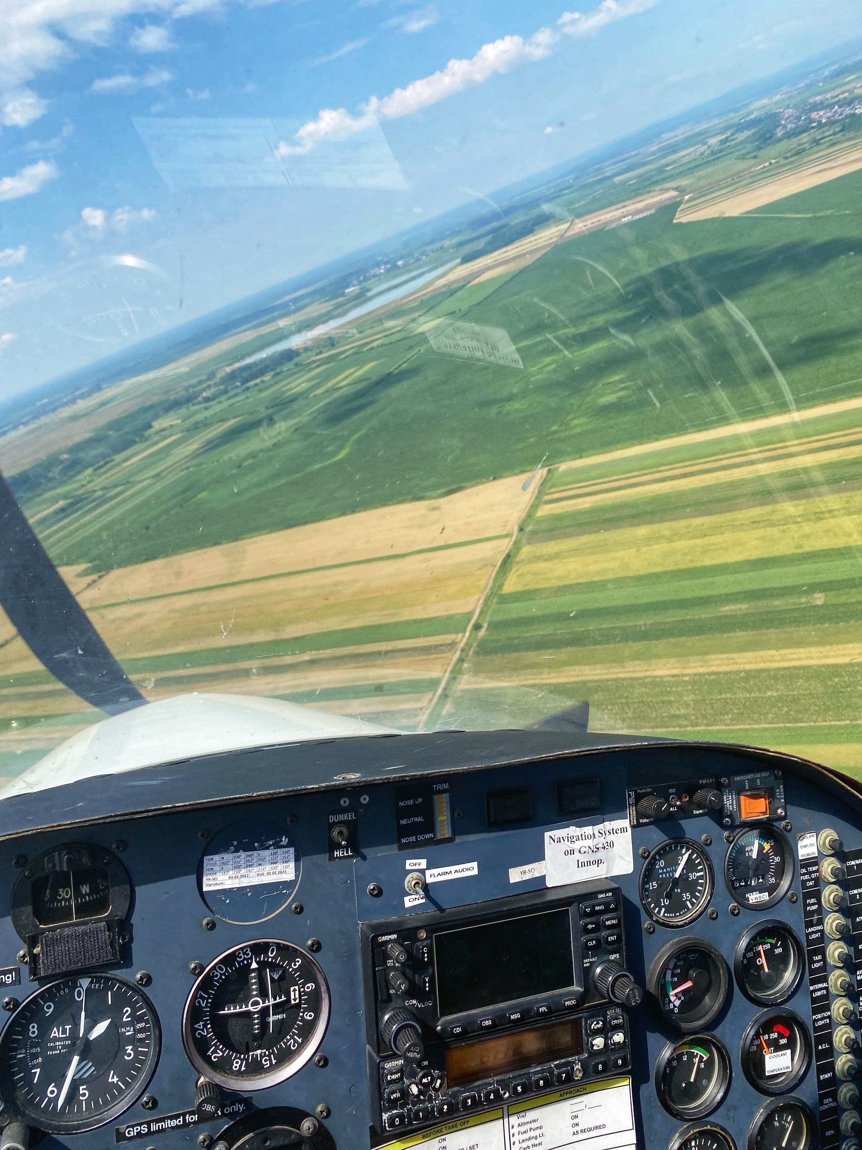 Odată sus, am voie să ghidez avionul cu comenzi duble: stânga, dreapta, urcă un pic, fă un arc de cerc. Simplu, nu? mă întreabă Alex. E simplu să tragi într-o parte și în alta de manetă, bineînțeles, când ai pilotul experimentat lângă tine, cu setul lui de comenzi. Cu siguranță mult mai complex să înveți cu adevărat să pilotezi.