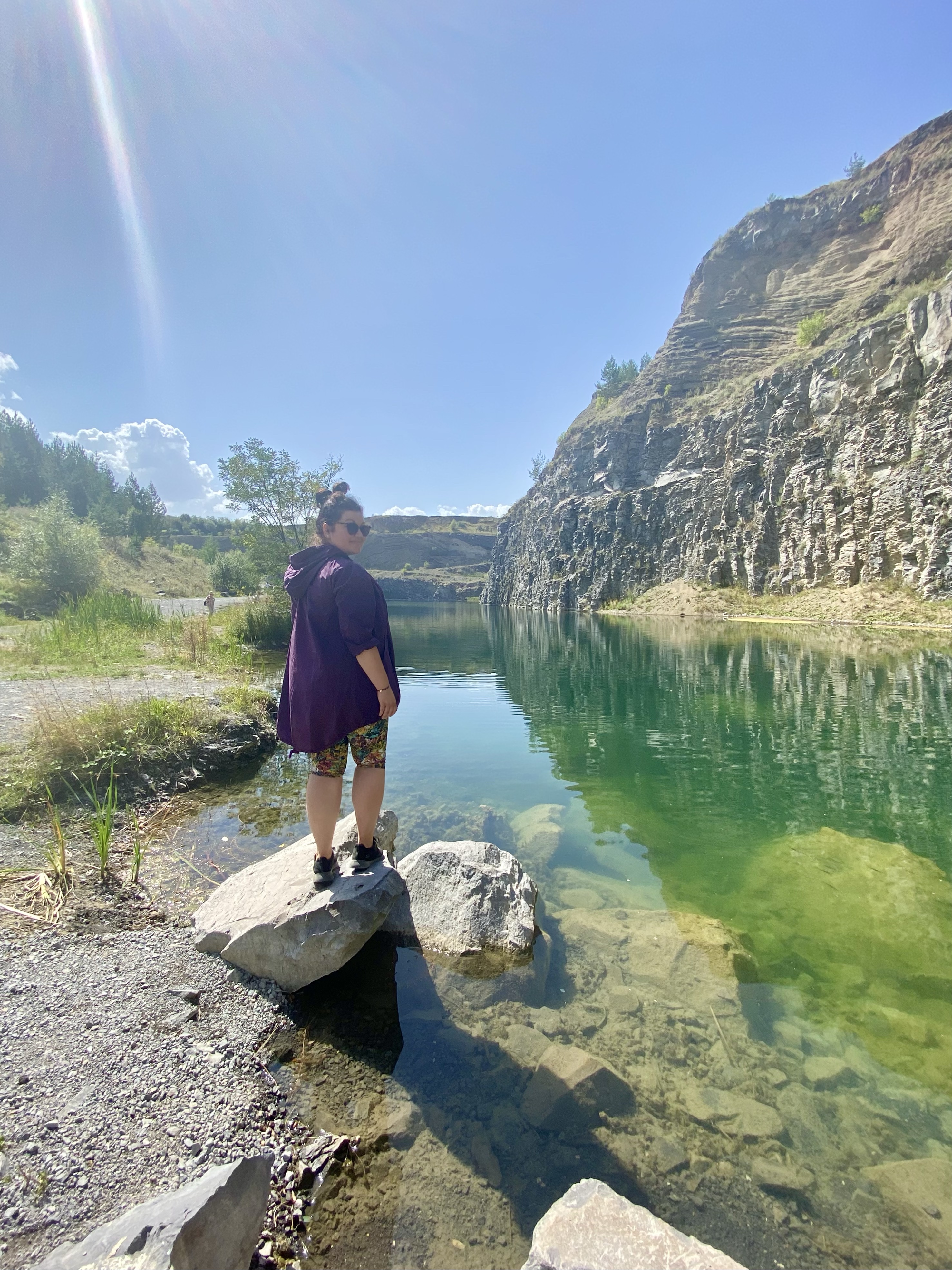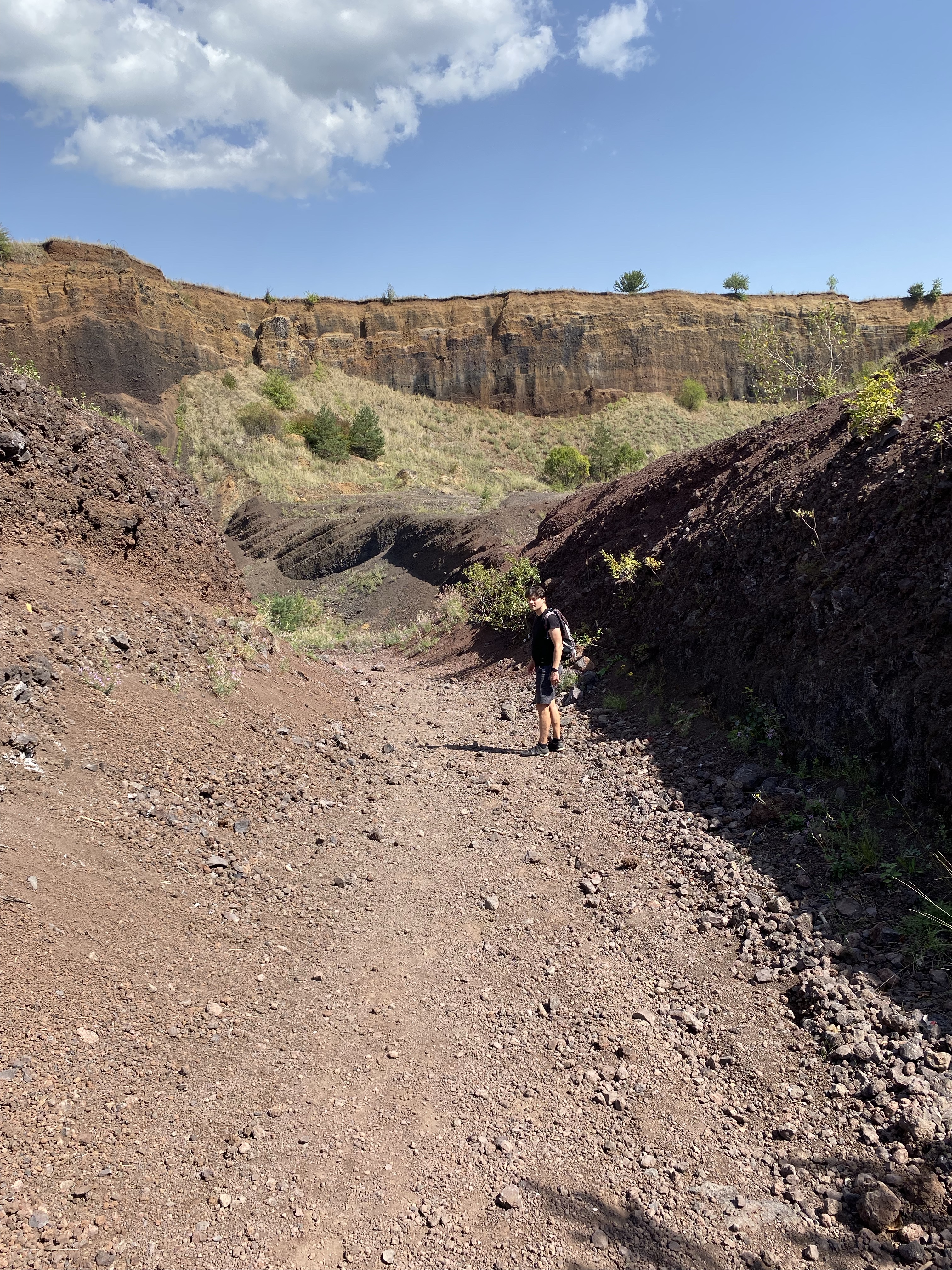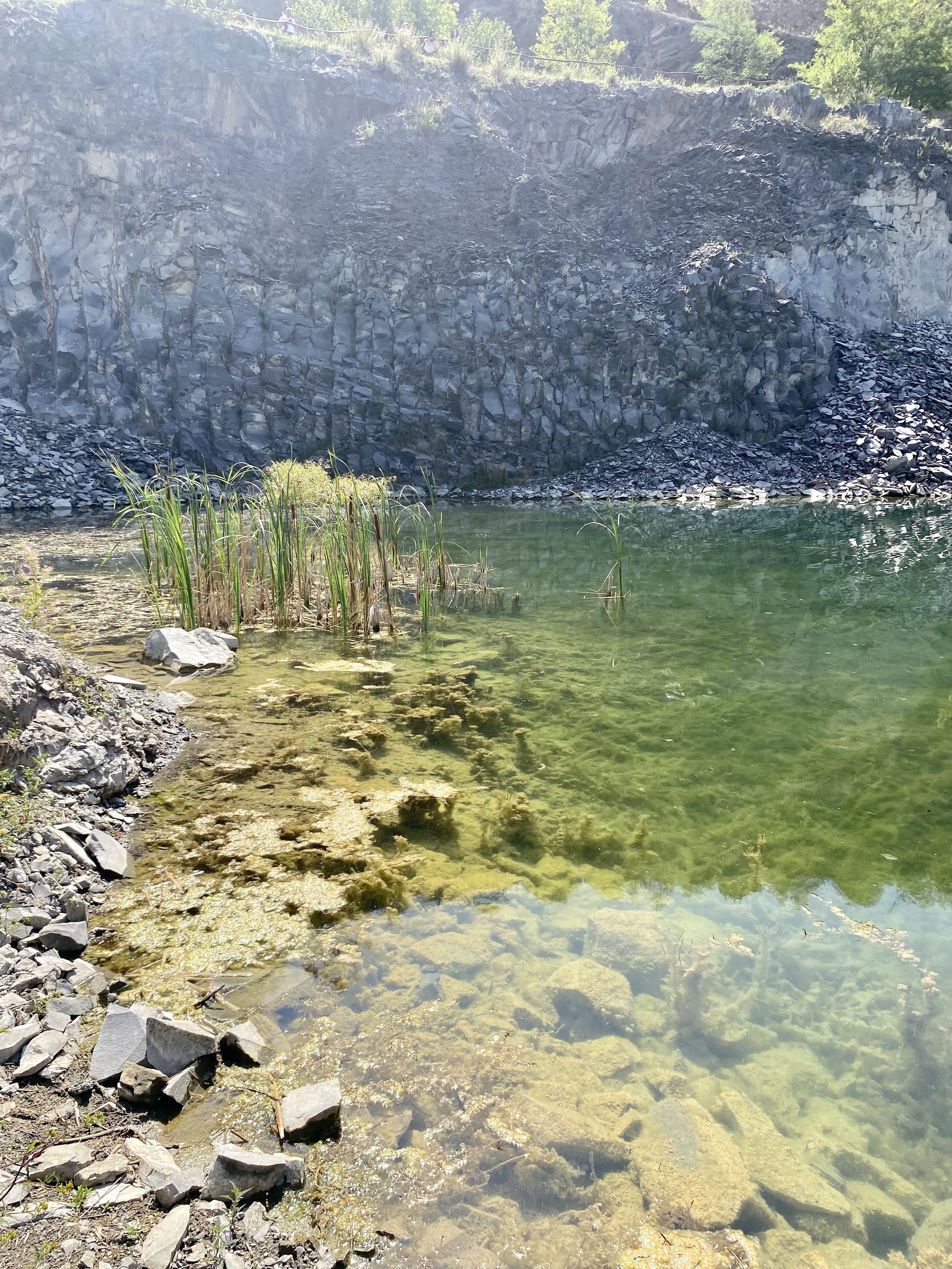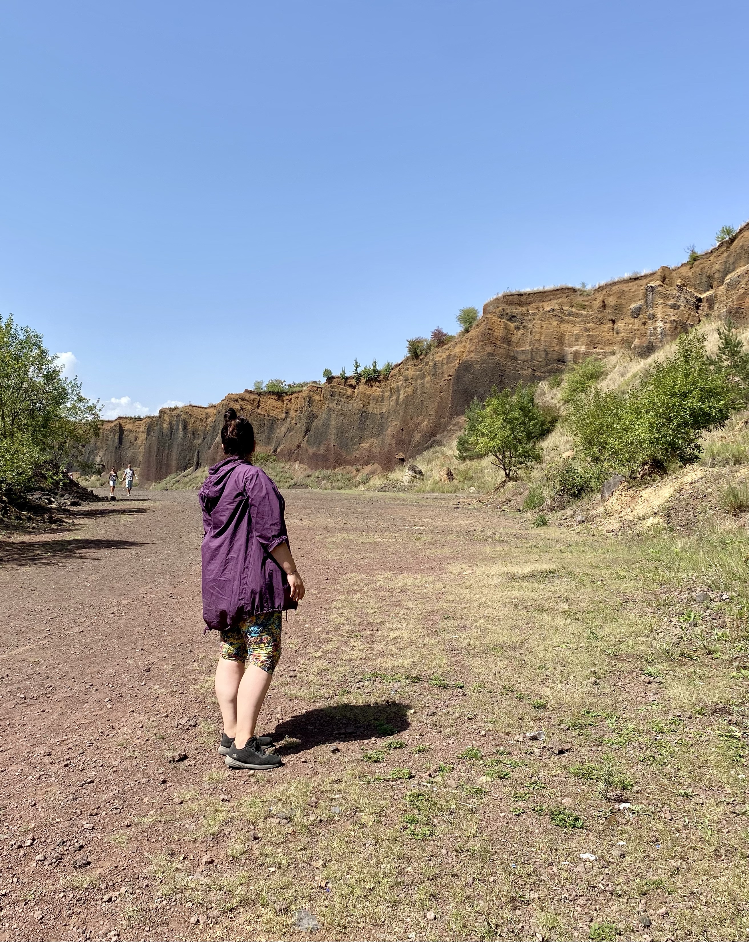 Noi începem vizita cu Lacul de Smarald, aflat pe locul fostei Cariere Brazi. Au săpat până au dat de nişte mici izvoare, dar majoritatea apei vine din precipitaţii, aflăm de pe pancarta informativă din zonă. Aş zice că denumirea e mai poetică decât culoarea lui reală, dar într-adevăr e verzui de la alge şi nişte particule fine de rocă din apă. Şi arată foarte drăguţ cu malurile din rocă bazaltică. Vreau să îl văd mai de aproape şi cobor pe o potecă „neoficială”, numai ca să aflu cu o durere ascuţită de posterior şi un nor de praf ridicat cât de alunecos e solul vulcanic. Dacă mergeţi cu adidaşi de alergat, ca noi, sau altceva şi mai puţin aderent, rămâneţi pe drumul principal.