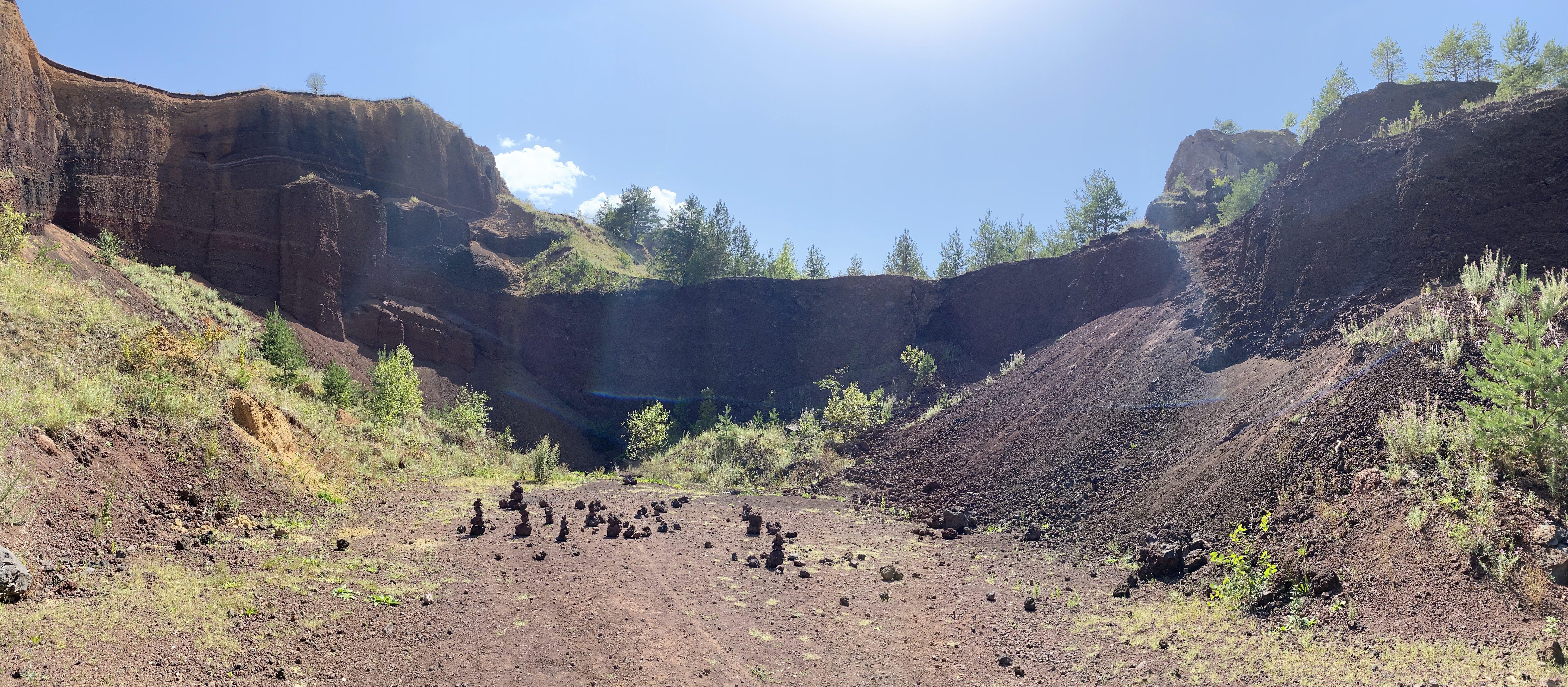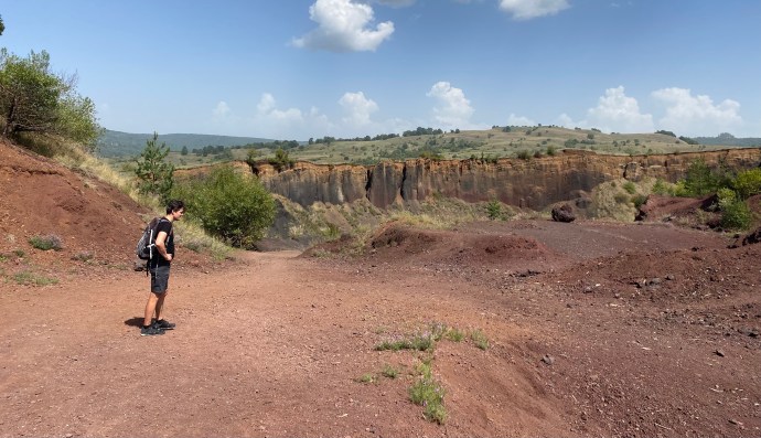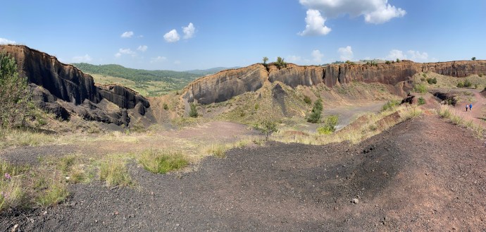 O luăm apoi spre vulcan, înconjurând lacul pe dealul de deasupra. Vulcanul stins e bijuteria situaţiei din punctul meu de vedere şi e frumuşel şi fotogenic din orice parte, cu rocile lui negre, roşii şi galbene şi vegetaţia înconjurătoare care a profitat de fertilitatea solului. În con a fost carieră de scorie bazaltică, astfel că acum se poate coborî înăuntru într-un peisaj arid, exotic, aş zice, pentru România. Anul trecut s-au filmat scene pentru un (alt) film Django aici şi nu se putea vizita. Acum se poate, dar nu a mai rămas nimic din căsuţele ridicate pentru filmare, ceea ce are sens într-o arie protejată; mi-ar fi plăcut, însă, să le văd, păreau pitoreşti din poze.