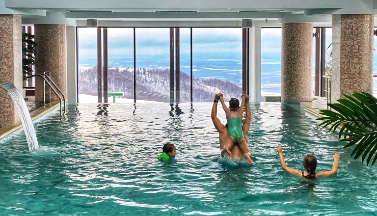 O zic la modul pozitiv: dacă stai doar vreo 2 zile, poți liniștit să nu ieși deloc de acolo. Are cazare, restaurant, piscină și spa interioare, piscină exterioară și loc de joacă afară pentru vremea caldă. Plus priveliște frumoasă foc.